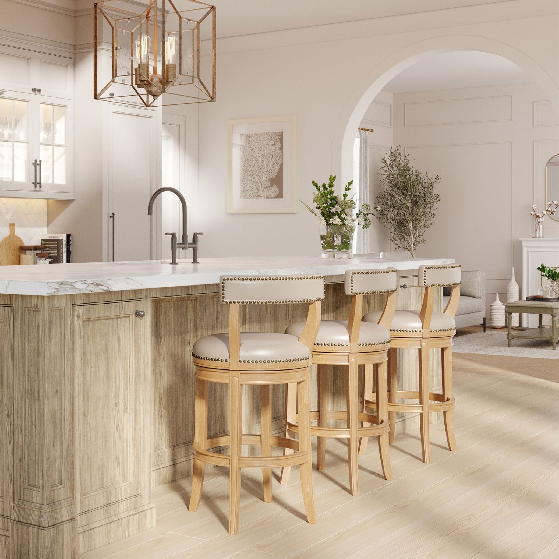 The epitome of sleek sophistication, our Alexander Stool is essential. With each hand-crafted detail, like a fine wine, this kitchen barstool with back keeps getting better. A kiln-dried, solid wood frame and premium PU leather upholstery synchronously collide to exceed your expectations while bestowing beauty upon your home dining space. The hand-applied nailhead trim and hand-carved woodwork undoubtedly display why elegance is all in the details. The smooth, rotating swivel seat allows our wooden bar stools to remain stationary as you pivot, while the 180-degree memory return swivel will take you right back to your counter for your daybreak cappuccino upon request. The comfy yet sturdy vegan leather upholstered seat and low-profile backrest comfortably support your entire crew for all celebrations, big and small. Flawlessly at home, tucked beneath your breakfast bar, kitchen booth, or countertop island, our swivel barstools are precisely what your space desires and offer impeccable attention to detail you'll admire. We offer counter height stools and bar height stools, so you can select the stool to fit your vision flawlessly. Please measure your space before ordering, as we recommend approximately 10" between the bottom of the counter surface and the top of the stool cushion when fully assembled for ideal comfort. Simple assembly is required for each stool, and the included tools and directions make setup a breeze. At Maven Lane, our wood stools are meticulously handcrafted with methods to stand the test of time, including hand finishes displaying impeccable attention to detail and mortise-and-tenon joinery, which promotes strength and longevity. Furthermore, by utilizing premium upholstery and kiln-dried hardwood in our solid wood furniture, we've solidified the superiority of craftsmanship. Given the handmade nature of our products, minimal variations may occur in color, tone, and wood finish.