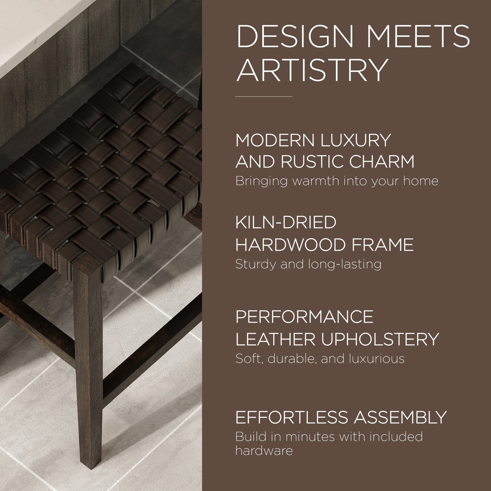 Embrace the warm, earthy tones and natural rustic charm of our Maven Lane Emerson Backless Counter Stool. Strips of supple, quality vegan leather are woven together to create a supportive seat with a tranquil vibe you’ll never tire of, while a sturdy kiln-dried hardwood base provides the strength needed for catching up with family and friends. Creating an airy, and modern feel in your home dining space is what Emerson kitchen stools do best, and this effortlessly exquisite wood barstool is paired to perfection with your kitchen island, narrow countertop, or beside your bistro table. We offer counter height stools and bar height stools, so you can select the most comfortable seating to fit your style and vision flawlessly. Please measure your space before ordering, as we recommend approximately 10" between the bottom of the counter surface and the top of our stool cushion when fully assembled for ideal comfort. Simple assembly is required for each kitchen island stool, and the included tools and directions make setup a breeze. At Maven Lane, our well-made wooden furniture is meticulously handcrafted with methods to stand the test of time, including hand finishes displaying an impeccable attention to detail, and mortise-and-tenon joinery, which promotes strength and longevity. Furthermore, by utilizing premium upholstery materials and kiln-dried hardwood in our solid wood furniture, we’ve solidified the superiority of craftsmanship you’ve come to expect from Maven Lane. Given the handmade nature of our products, minimal variations may occur in color, tone, and wood finish.