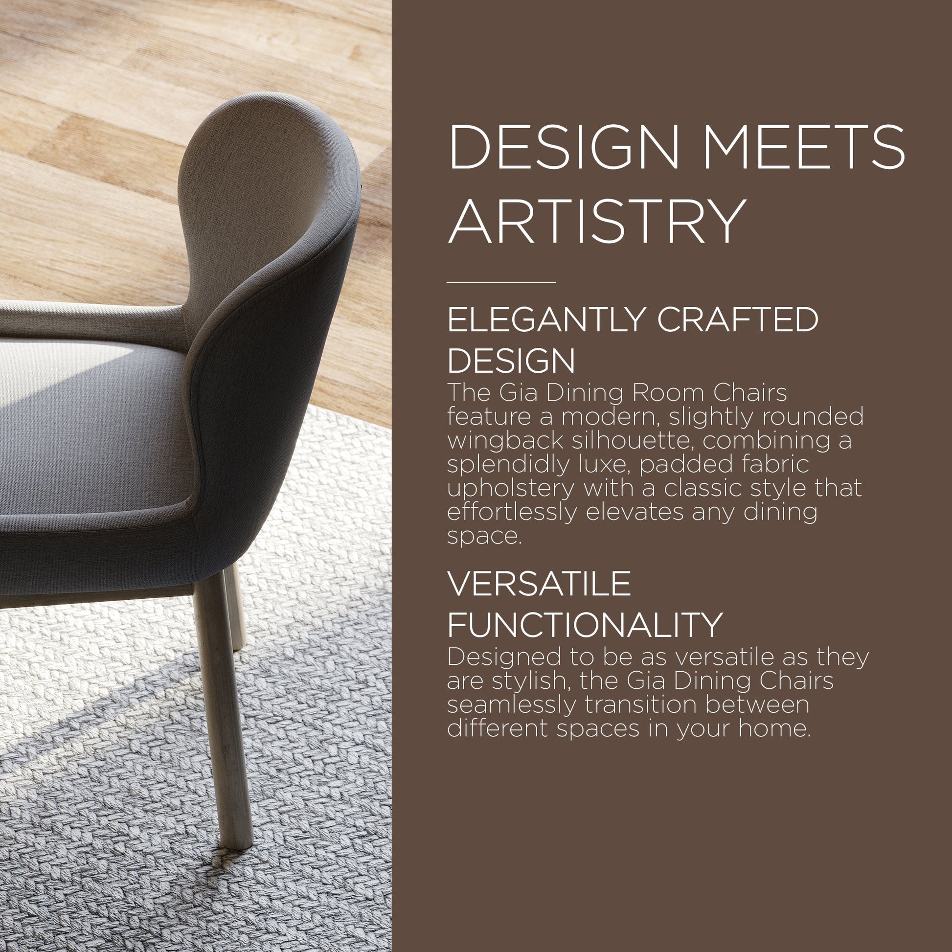 A simple and subtle stunner, our modern Gia Dining Room Chairs boast a slightly rounded wingback silhouette, splendidly luxe, padded fabric upholstery, and a classic style that can do no wrong. As versatile as the day is long, Gia Dining Chairs are equally at home in your breakfast nook or dining room, just as they can easily become your newest comfy kitchen chairs. Neutral tones and gentle slopes bring warmth and class to your dining space or dinette furniture, while every single meticulously, hand-crafted detail is exceptionally elegant and beautiful. A wooden frame in a sophisticated and antiqued wood finish, mixed with a premium fabric upholstered cushion offers a lavish dining experience, as you create a lifetime of memories. At Maven Lane, our well-made home furniture is meticulously handcrafted with methods to stand the test of time including hand finishes displaying an impeccable attention to every small detail, and sturdy mortise-and-tenon joinery techniques which promote strength and longevity. Furthermore, by utilizing premium materials and kiln-dried hardwood in our solid wood furniture, we’ve solidified the superiority of craftsmanship you’ve come to expect from Maven Lane. Be sure to view the other pieces in our furniture collection. We've carefully curated an entire medley of heirloom-quality pieces that can be mixed and matched to create the aesthetic your home has been seeking. Given the handmade nature of our products, minimal variations may occur in color, tone, and wood finish.