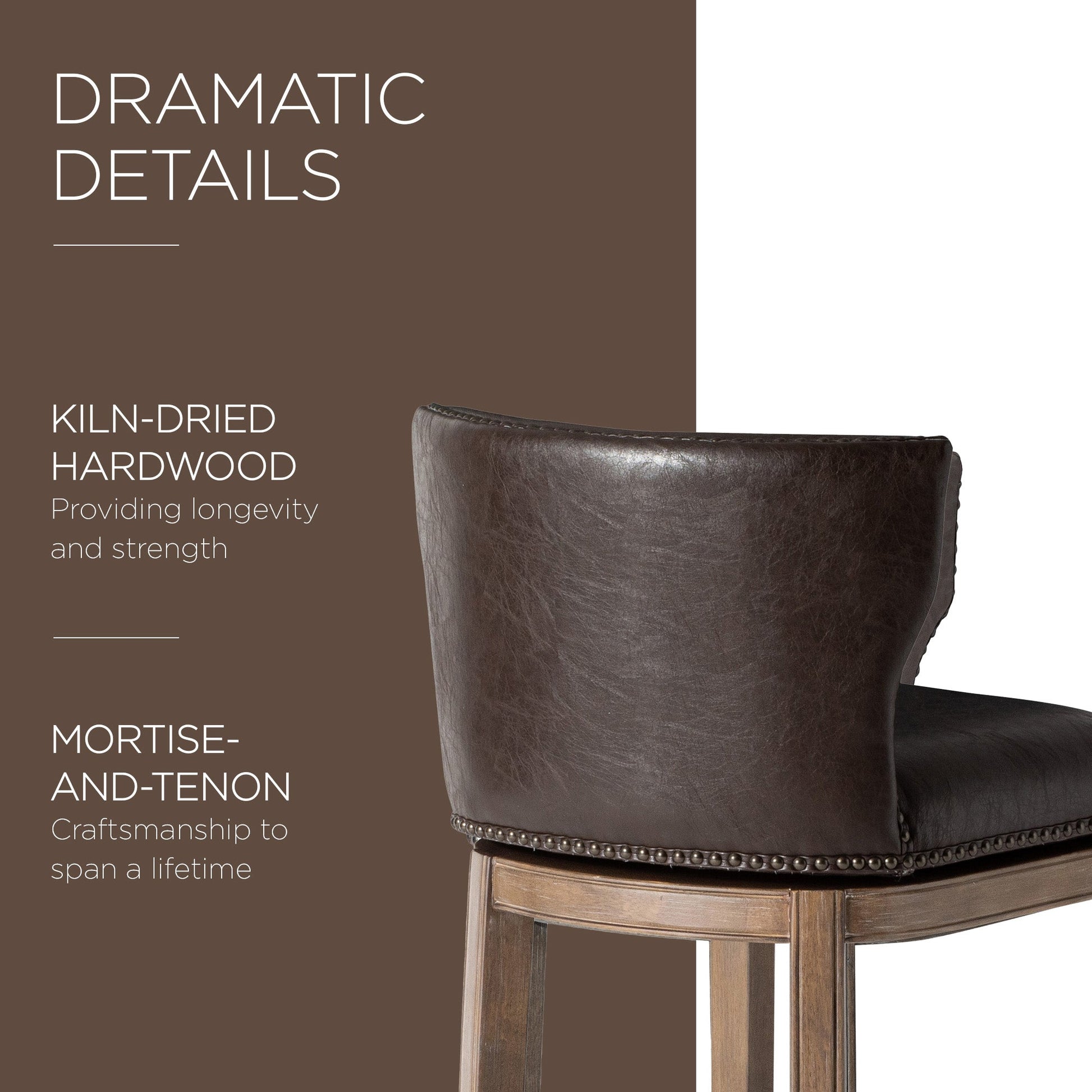 Combining picture-perfect button-tufted PU leather with a traditional wingback silhouette while keeping the look fresh is no easy feat. Our top-quality Hugo Stool with low back is the stunner you didn't know you needed. A solid natural wood frame and premium vegan leather upholstery create the ultimate collaboration to surpass your wildest home dining dreams. The smooth swivel seat with back support allows our wooden barstools to remain stationary as you pivot, while the 180-degree memory return swivel allows you to chat, wine, and dine at your countertop with ease. Delicate details like hand-applied nailhead trim and this barstool's understated hand-carved woodwork display the meticulous craftsmanship of every piece. Transitional with a timeless spin, this stool looks flawless with any fancy or neutral home aesthetic and can pull more modern or traditional depending on the pieces you pair it with. Alongside your bistro table or kitchen island is where this faux leather upholstered stool truly shines. We offer counter height and bar height stool options, so you can select the most comfortable stool to fit your vision flawlessly. Please measure your space before ordering, as we recommend approximately 10" between the bottom of the counter surface and the top of the stool cushion when fully assembled for ideal comfort. At Maven Lane, our furniture is meticulously handcrafted with goods and methods to stand the test of time, including hand finishes displaying impeccable attention to detail and sturdy mortise-and-tenon joinery, which promotes strength and longevity. Furthermore, by utilizing premium upholstery and solid oak in our wood furniture, we've solidified the superiority of craftsmanship you've come to expect from Maven Lane. We've carefully curated an entire medley of heirloom-quality pieces that can be mixed and matched to create the aesthetic of your home. Given the handmade nature of our products, minimal variations may occur in color, tone, and wood finish.