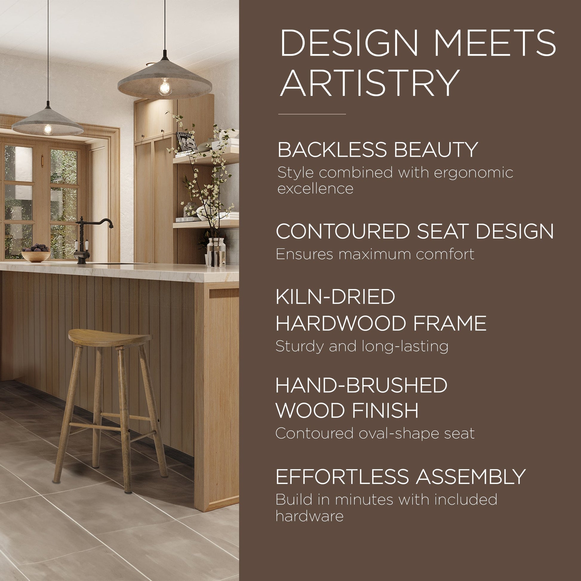 - Hand-brushed wood finish and contoured oval-shape seat, the stool is constructed by artisans to display impeccable attention to detail and superb craftsmanship