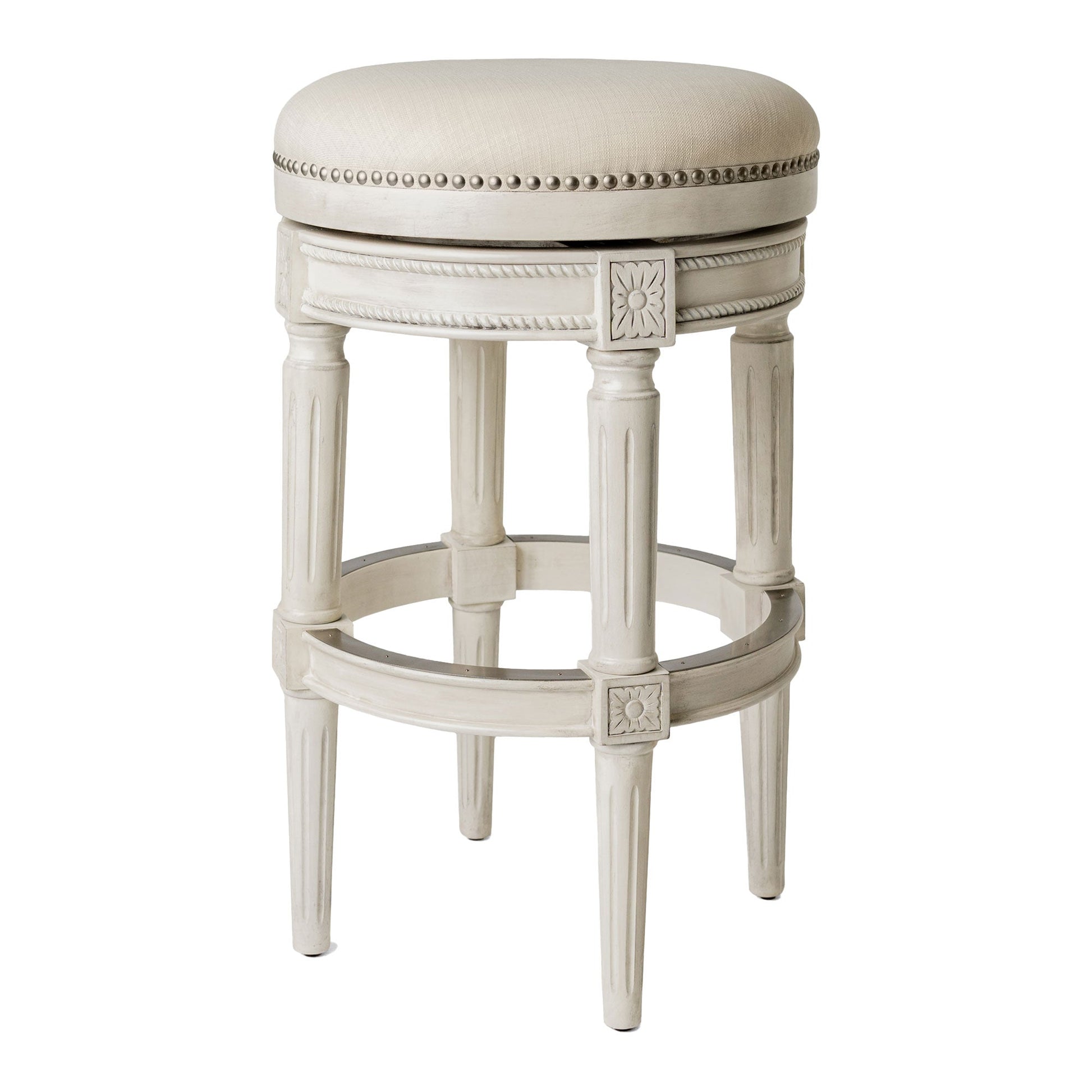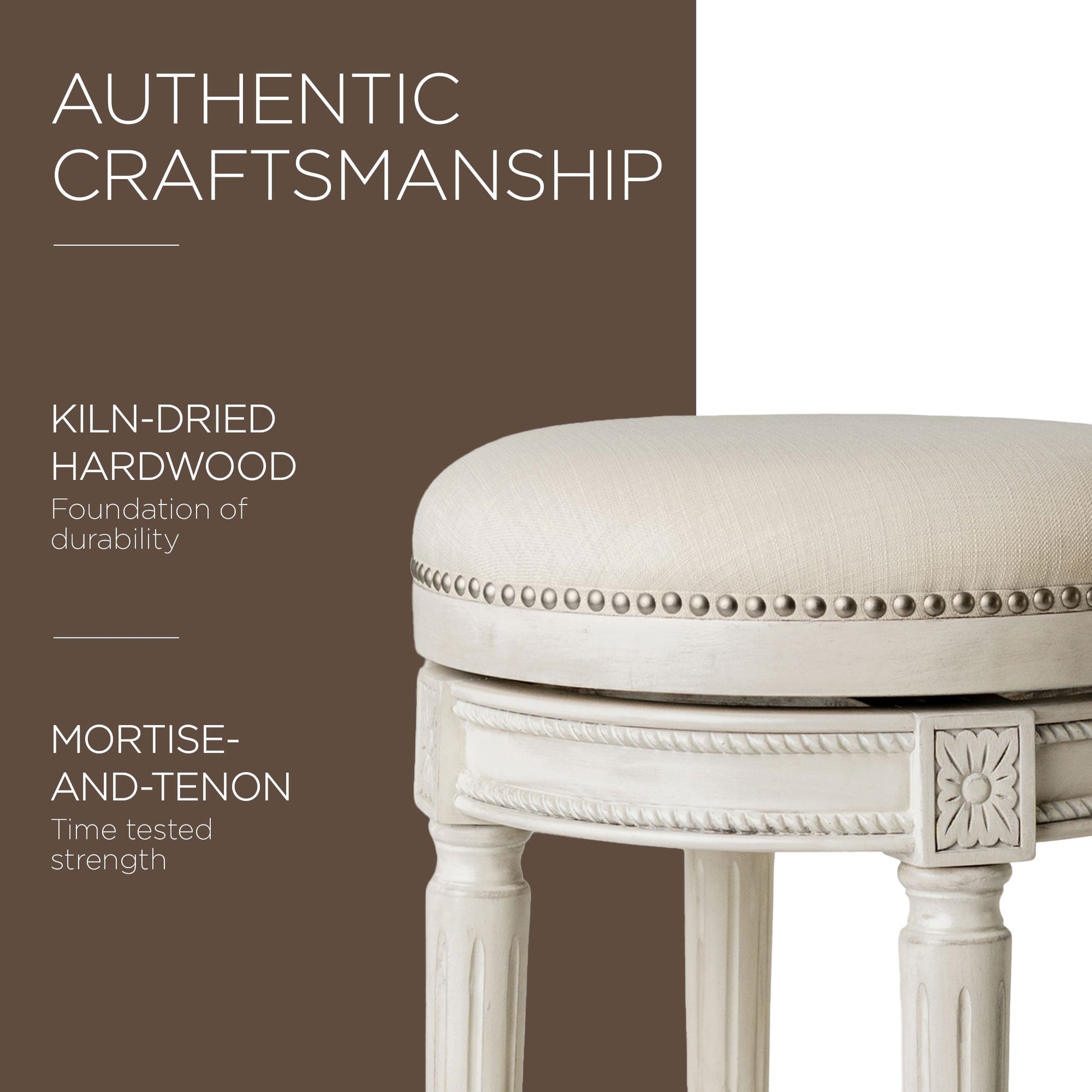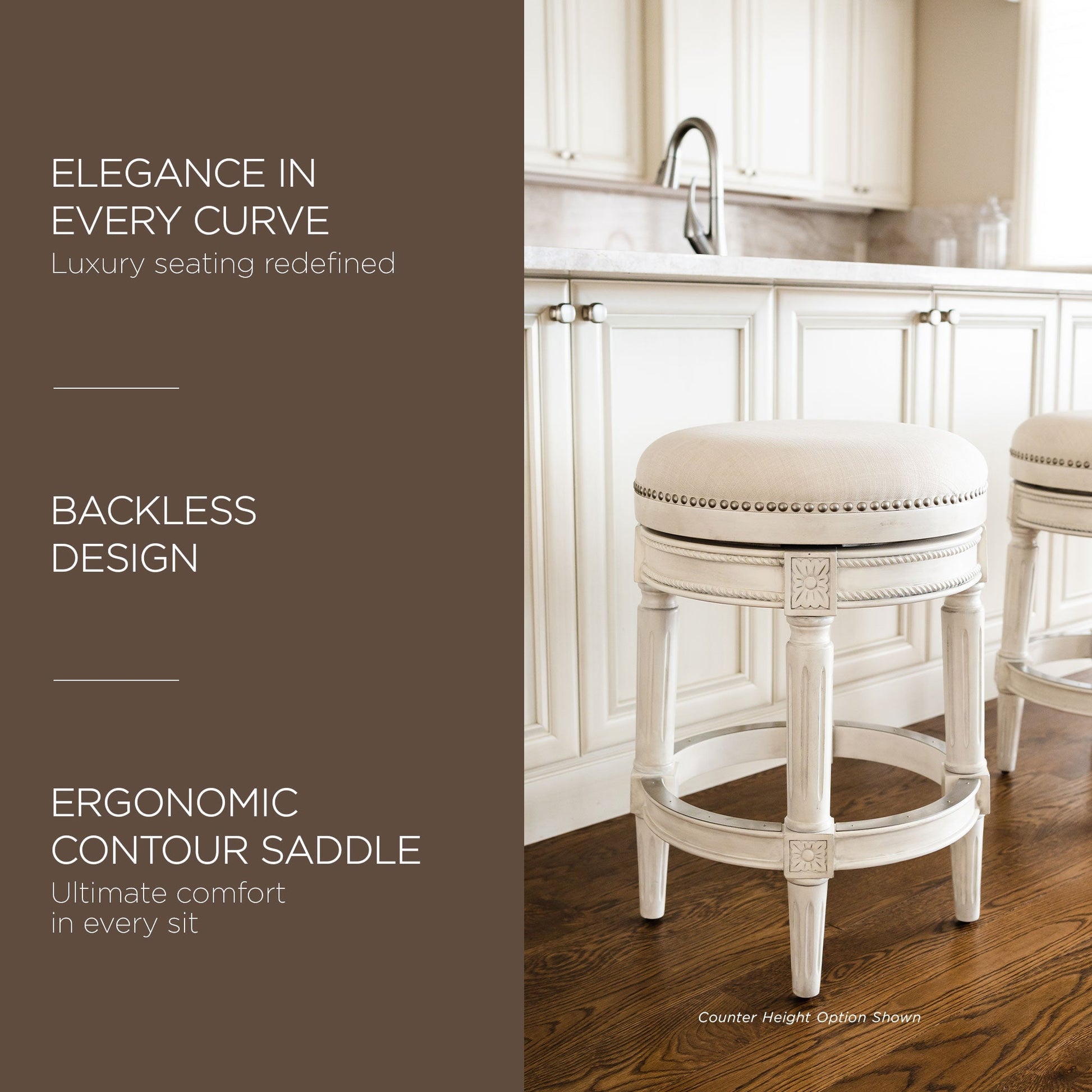 Good looks run in the family, and this Maven Lane Pullman Backless Stool is the epitome of perfection. Just like the widely popular Pullman Stool, our Backless Pullman is just that—backless— and is the ideal kitchen seating solution when you’re in need of a shorter silhouette. Our Pullman Backless Kitchen Stool brings elegance and charm to your home dining space with every meticulously hand-crafted detail. A kiln-dried, solid wood frame and premium fabric-upholstered seat cushion harmoniously combine to comfortably support you, your friends, and your family. Exceedingly extraordinary, the features on our Pullman Stools are expertly executed, right down to the hand-applied nailhead trim and hand-carved detailing you’ll adore. The gliding swivel allows the barstool to remain stationary while easily hopping on and off the stool—a perk appreciated by all ages. Perfect for use at your kitchen island, breakfast bar, or countertop bistro dining table, these rotating stools bring the refinement you've been seeking for your space with unrivaled craftsmanship. We offer counter height and bar height stool options, so you can select the stool to fit your vision. Please measure your space before ordering. We recommend approximately 10" between the bottom of the counter surface and the top of the stool cushion for optimal comfort. Minimal assembly is required for each stool, and the included tools and directions make setup a breeze. Pullman backless counter-height stool dimensions and specifications when fully assembled: 24" W x 26" H x 20.3" D. Pullman backless bar-height stool dimensions and specifications: 30" W x 31" H x 20.3" D. Given the handmade nature of our products, minimal variations may occur in color, tone, and wood finish.