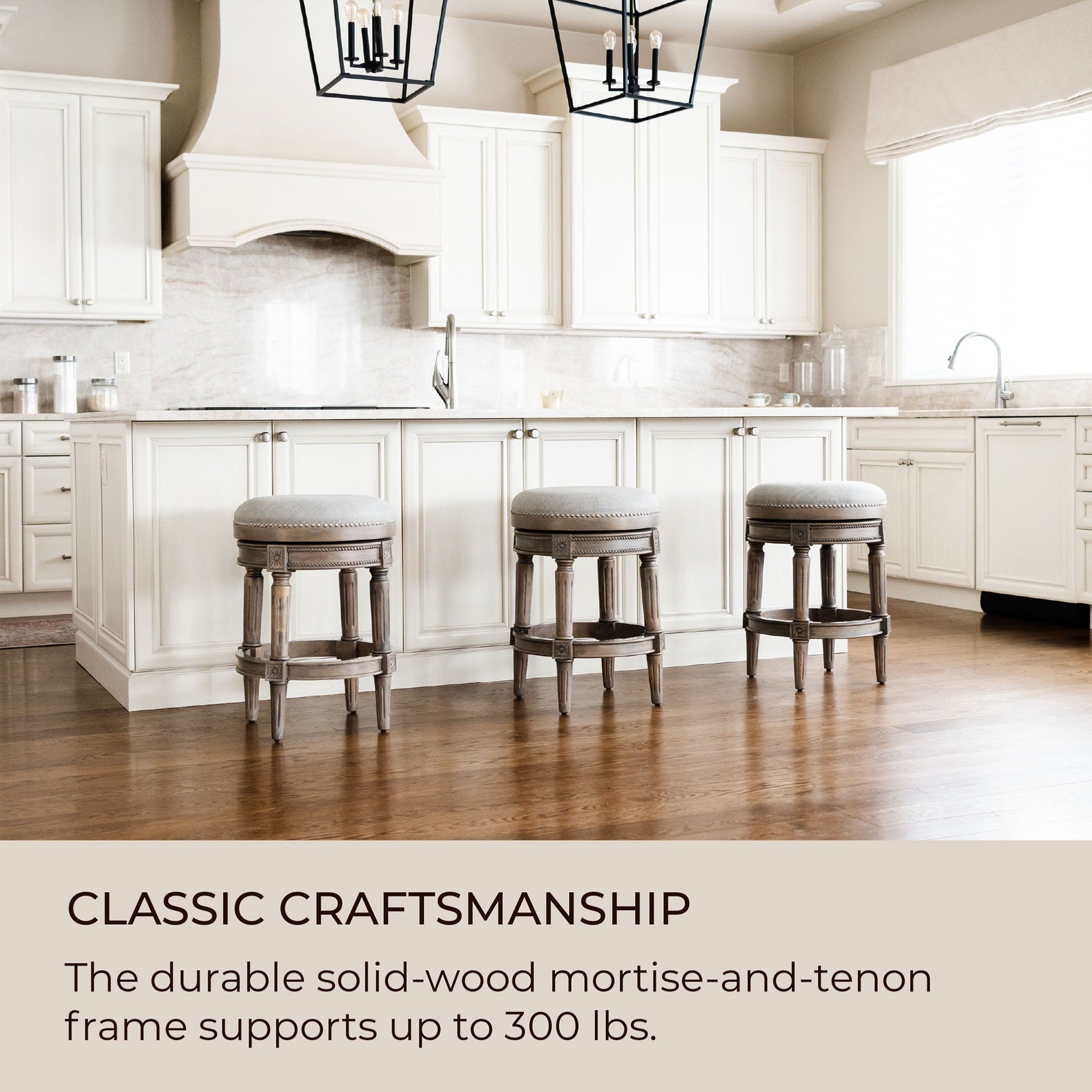 Good looks run in the family, and this Maven Lane Pullman Backless Stool is the epitome of perfection. Just like the widely popular Pullman Stool, our Backless Pullman is just that—backless— and is the ideal kitchen seating solution when you’re in need of a shorter silhouette. Our Pullman Backless Kitchen Stool brings elegance and charm to your home dining space with every meticulously hand-crafted detail. A kiln-dried, solid wood frame and premium fabric-upholstered seat cushion harmoniously combine to comfortably support you, your friends, and your family. Exceedingly extraordinary, the features on our Pullman Stools are expertly executed, right down to the hand-applied nailhead trim and hand-carved detailing you’ll adore. The gliding swivel allows the barstool to remain stationary while easily hopping on and off the stool—a perk appreciated by all ages. Perfect for use at your kitchen island, breakfast bar, or countertop bistro dining table, these rotating stools bring the refinement you've been seeking for your space with unrivaled craftsmanship. We offer counter height and bar height stool options, so you can select the stool to fit your vision. Please measure your space before ordering. We recommend approximately 10" between the bottom of the counter surface and the top of the stool cushion for optimal comfort. Minimal assembly is required for each stool, and the included tools and directions make setup a breeze. Pullman backless counter-height stool dimensions and specifications when fully assembled: 24" W x 26" H x 20.3" D. Pullman backless bar-height stool dimensions and specifications: 30" W x 31" H x 20.3" D. Given the handmade nature of our products, minimal variations may occur in color, tone, and wood finish.
