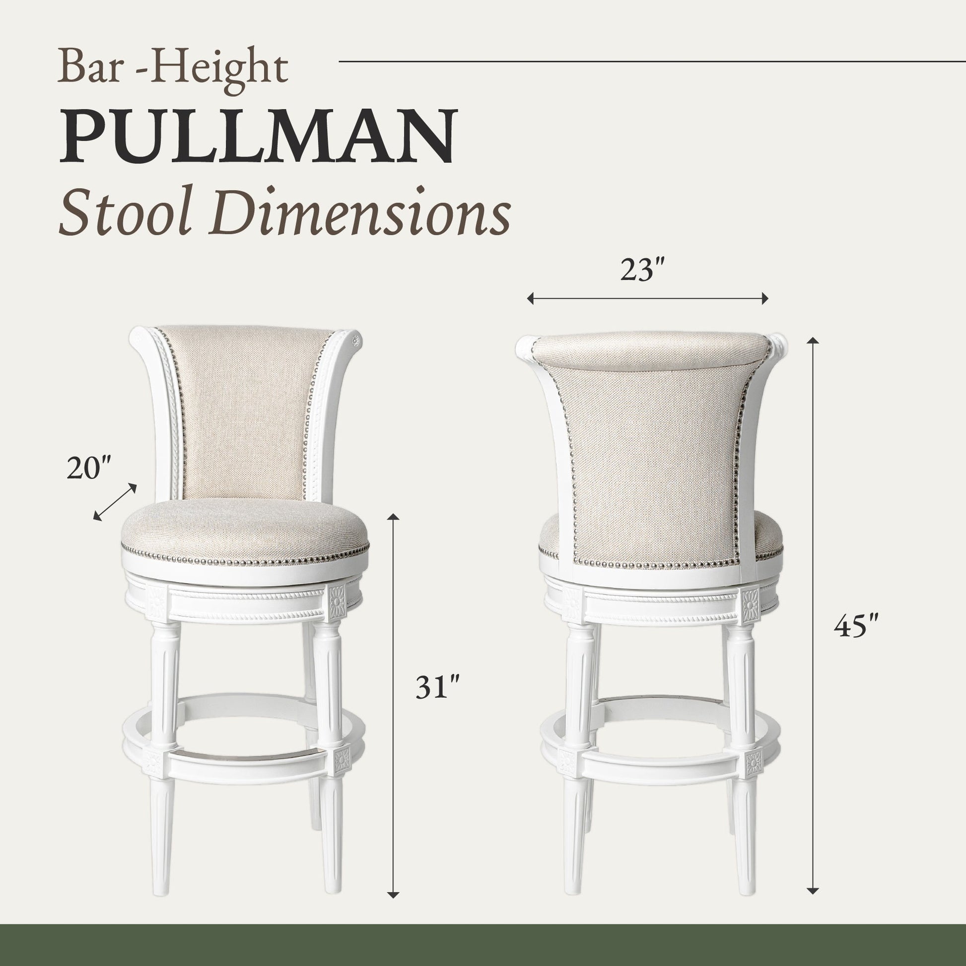 Effortlessly at home in any abode, this Maven Lane Pullman Bar Stool aims to bring sophisticated elegance and charm to your dining space with every meticulously hand-crafted detail. A kiln-dried, solid wood frame and premium fabric upholstery harmoniously combine to comfortably support you, your friends, and your family. Exceedingly extraordinary, the features on our Pullman Stools are expertly executed, right down to the hand-applied nailhead trim and hand-carved detailing you’ll adore. The gliding swivel allows the barstool to remain stationary while easily hopping on and off the stool—a perk appreciated by all ages. Perfect for use at your kitchen island, breakfast bar, or bistro dining table, these swivel kitchen stools bring the refinement you've been seeking for your space with unrivaled craftsmanship. We offer counter height and bar height stool options, so you can select the stool to fit your vision. Please measure your space before ordering. We recommend approximately 10" between the bottom of the counter surface and the top of the stool cushion for optimal comfort. Minimal assembly is required for each stool, and the included tools and directions make setup a breeze. Pullman high-back counter-height stool dimensions and specifications: 20" W x 26" H x 24" D. Pullman high-back bar-height stool dimensions and specifications: 20" W x 31" H x 24" D. Given the handmade nature of our products, minimal variations may occur in color, tone, and wood finish.
