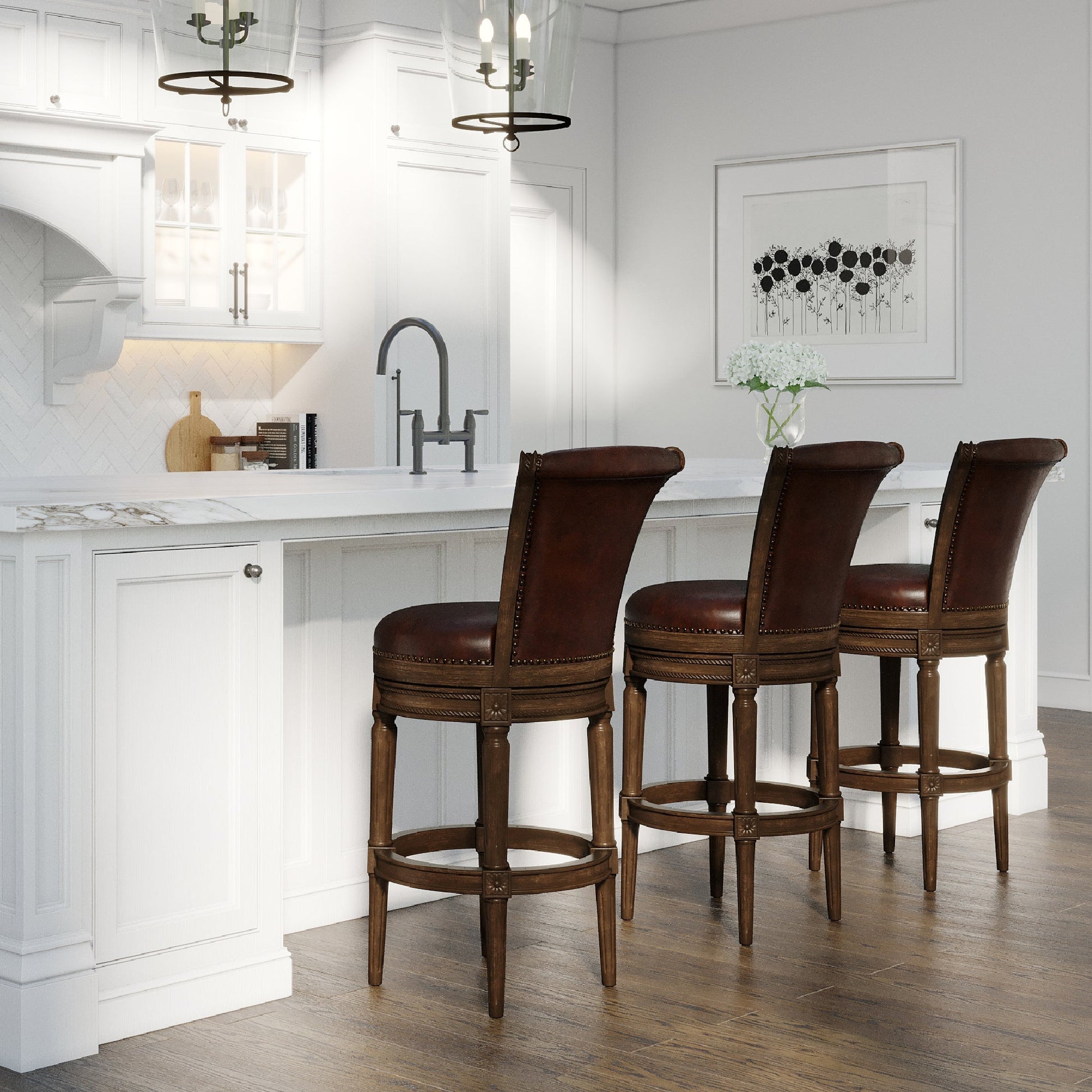 Effortlessly at home in any abode, this Maven Lane Pullman Bar Stool aims to bring sophisticated elegance and charm to your dining space with every meticulously hand-crafted detail. A kiln-dried, solid wood frame and premium vegan leather upholstery harmoniously combine to comfortably support you, your friends, and your family. Exceedingly extraordinary, the features on our Pullman Stools are expertly executed, right down to the hand-applied nailhead trim and hand-carved detailing you’ll adore. The gliding swivel allows the barstool to remain stationary while easily hopping on and off the stool—a perk appreciated by all ages. Perfect for use at your kitchen island, breakfast bar, or bistro dining table, these swivel kitchen stools bring the refinement you've been seeking for your space with unrivaled craftsmanship. We offer counter height and bar height stool options, so you can select the stool to fit your vision. Please measure your space before ordering. We recommend approximately 10" between the bottom of the counter surface and the top of the stool cushion for optimal comfort. Minimal assembly is required for each stool, and the included tools and directions make setup a breeze. Pullman high-back counter-height stool dimensions and specifications: 20" W x 26" H x 24" D. Pullman high-back bar-height stool dimensions and specifications: 20" W x 31" H x 24" D. Given the handmade nature of our products, minimal variations may occur in color, tone, and wood finish.