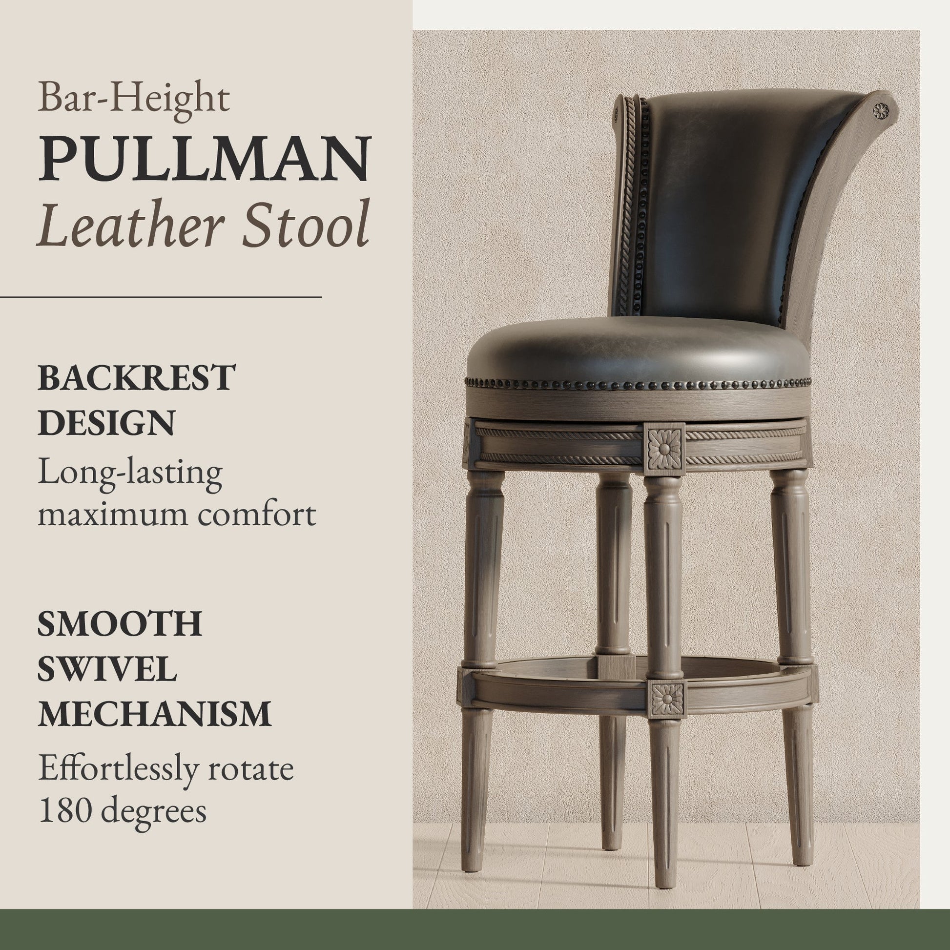 Effortlessly at home in any abode, this Maven Lane Pullman Bar Stool aims to bring sophisticated elegance and charm to your dining space with every meticulously, hand-crafted detail. A kiln-dried, solid wood frame and premium vegan leather upholstery harmoniously combine to comfortably support you, your friends, and your family. Exceedingly extraordinary, the features on our Pullman Stools are expertly executed, right down to the hand-applied nailhead trim and hand-carved detailing you’ll adore. The gliding swivel allows the barstool to remain stationary while easily hopping on and off the stool—a perk appreciated by all ages. Perfect for use at your kitchen island, breakfast bar, or bistro dining table, these swivel stools bring the refinement you've been seeking for your space with unrivaled craftsmanship. We offer counter height and bar height stool options, so you can select the stool to fit your vision. Please measure your space before ordering. We recommend approximately 10" between the bottom of the counter surface and the top of the stool cushion for optimal comfort. Minimal assembly is required for each stool, and the included tools and directions make setup a breeze. Pullman high-back counter-height stool dimensions and specifications: 20" W x 26" H x 24" D. Pullman high-back bar-height stool dimensions and specifications: 20" W x 31" H x 24" D. Given the handmade nature of our products, minimal variations may occur in color, tone, and wood finish.