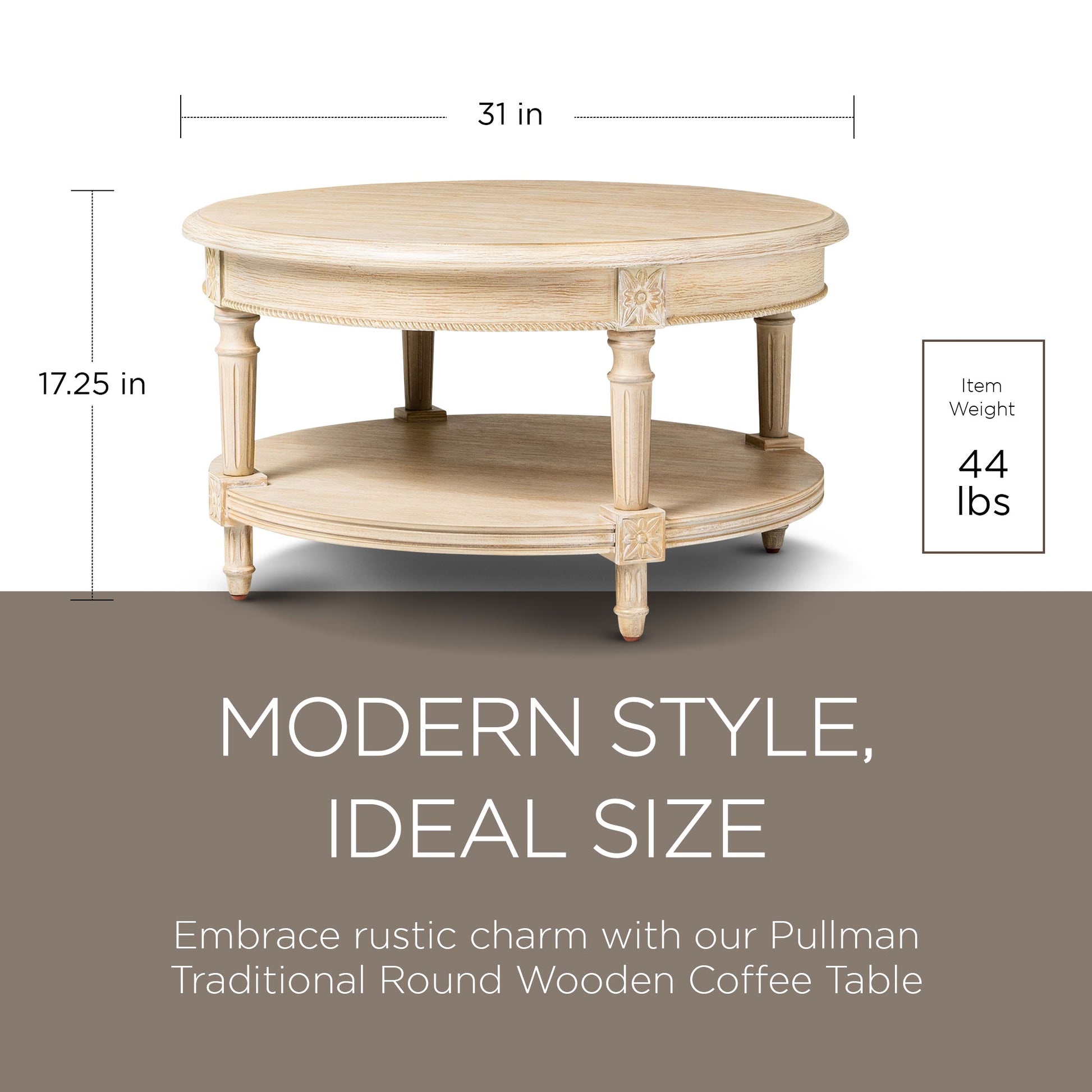 Maven Lane Pullman Traditional Round Wooden Coffee Table, Antiqued White Finish