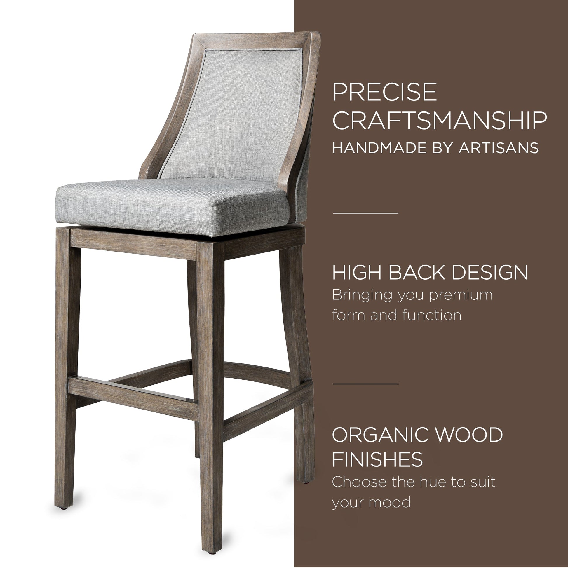 A modern take on a timeless design, our Vienna Stool with back rest boasts clean lines, a refined, narrow profile, and comfort for days. A kiln-dried, solid wood frame and premium fabric upholstery combine flawlessly and create the perfect neutral color palate to heighten your abode’s style and aesthetic. The smooth, padded swivel seat allows our wooden bar stools to remain stationary as you pivot, while the 180-degree memory return swivel allows you to socialize back and forth like a pro. You’ll notice the delicate details like the gentle, sloping back support and fabric piping trim that really sets this barstool apart from the rest. Take a closer look, and see the meticulous artistry that goes into the sturdy construction of each and every one of our kitchen countertop stools. This simple stunner brings a lavish yet relaxed vibe to your kitchen island or dining space—lending your guests a notion of welcoming hospitality and country charm. We offer counter height and bar height stool options, so you can select the stool to fit your vision flawlessly. Please measure your space before ordering, as we recommend approximately 10" between the bottom of the counter surface and the top of the stool cushion when fully assembled for ideal comfort. Simple assembly is required for each stool, and the included tools and directions make setup a breeze. At Maven Lane, our well-made furniture is meticulously handcrafted with methods to stand the test of time, including hand finishes displaying impeccable attention to detail and mortise-and-tenon joinery, which promotes strength and longevity. By utilizing premium upholstery and kiln-dried hardwood in our solid wood furniture, we’ve solidified the superiority of craftsmanship. We've carefully curated an entire medley of heirloom-quality pieces that can be mixed and matched to create the aesthetic your home has been seeking. Given the handmade nature of our products, minimal variations may occur in color, tone, and wood finish.