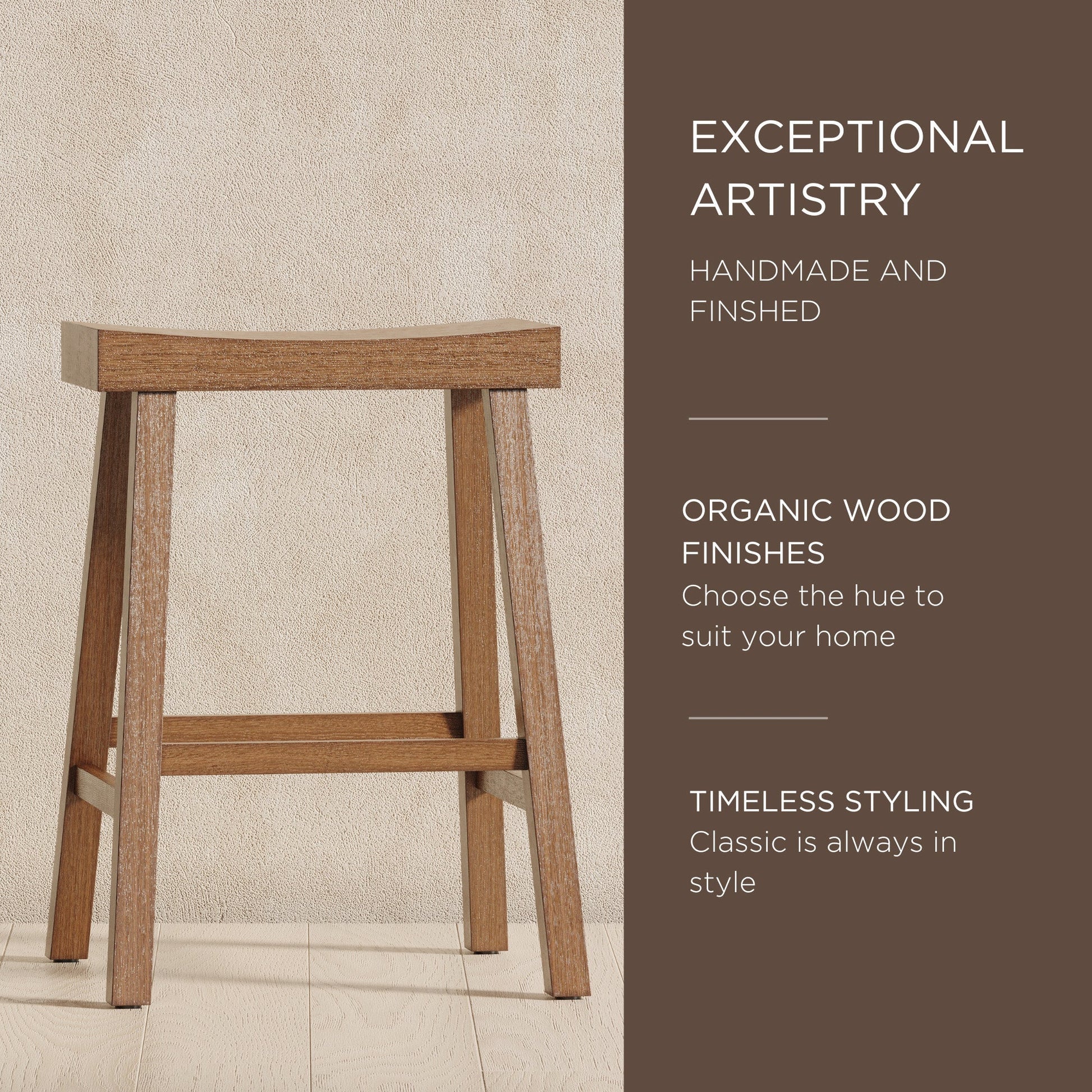 Classic with clean lines, Maven Lane Vincent Backless Barstool stands firmly at the forefront of your quality dining seating must-haves. Simplicity is key when designing a versatile kitchen stool, yet Vincent spares nothing in the pursuit of timeless style. Featuring a vintage, hand-brushed wooden finish that’s further accentuated by this hardwood stool’s natural wood grain, this solid wood stool is the natural beauty your space deserves. Expertly handcrafted with sturdy kiln-dried wood to ensure that this heavy-duty stool is equipped to stand the test of time, while a curved saddle seat ensures complete comfort to sit and catch up with your loved ones. Perfect for use at your kitchen island, narrow countertop, breakfast bar, or bistro dining table, these wood bar stools offer the extra finishing touch your space has been seeking. We offer counter height and bar height stool options, so you can select the most comfortable stool to fit your vision. Please measure your space before ordering. We recommend approximately 10" between the bottom of the counter surface and the top of the stool when fully assembled for optimal comfort. Minimal assembly is required for each stool, and the included tools and directions make setup a breeze. Vincent counter-height stool dimensions and specifications: 18" W x 26" H x 16" D. Vincent bar-height stool dimensions and specifications: 18" W x 31" H x 17.5" D. Minimal variations in color, tone, and wood finish may occur in our handmade furniture.