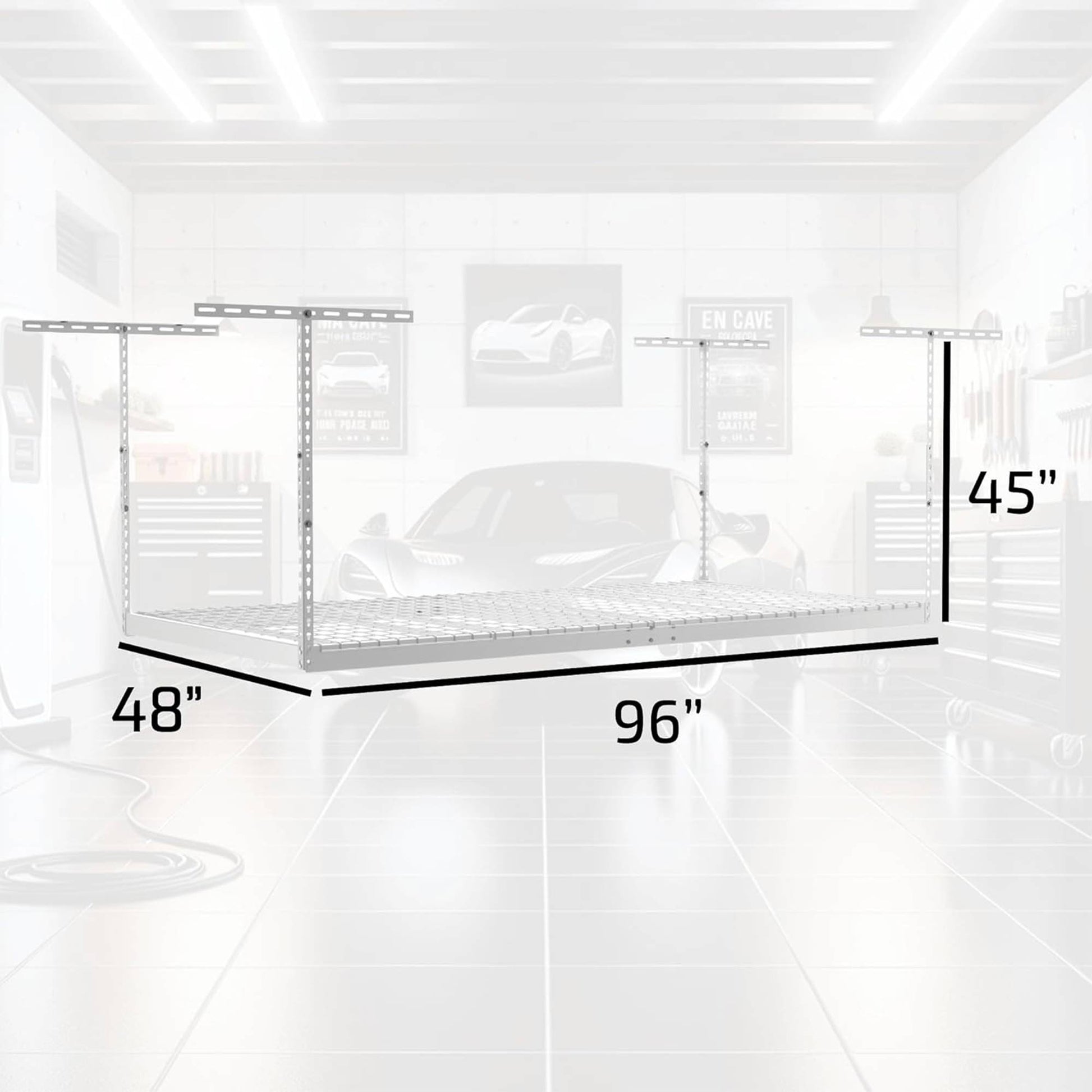 - Overhead garage storage rack tailored to fit seamlessly into any garage space, this 4 by 8-foot storage rack offers versatility and practicality