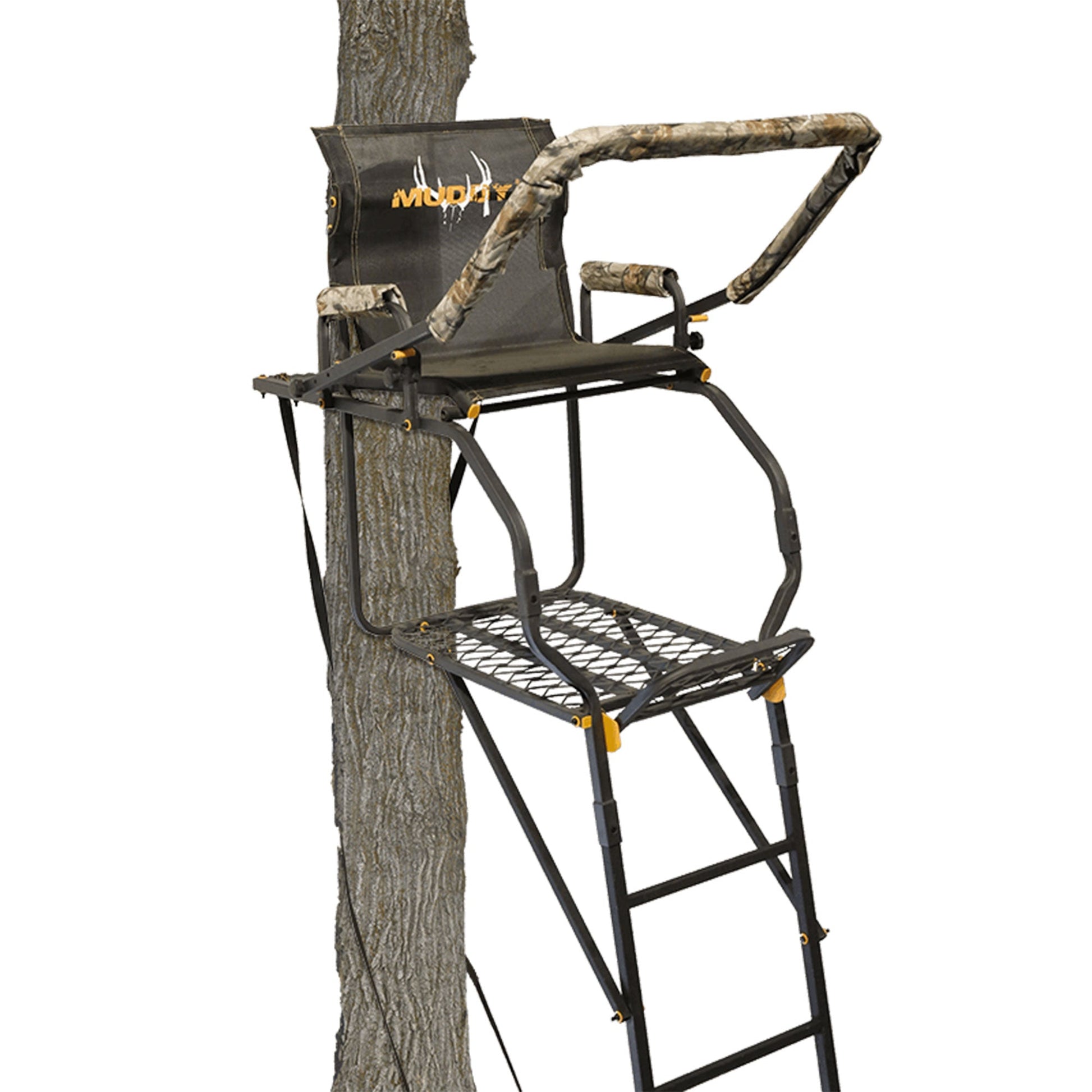 Take your hunt to the next level. The 17-Foot Huntsman Deluxe Ladder Stand by Muddy is a comfortable, heavy-duty tree hunting stand built for convenience.
