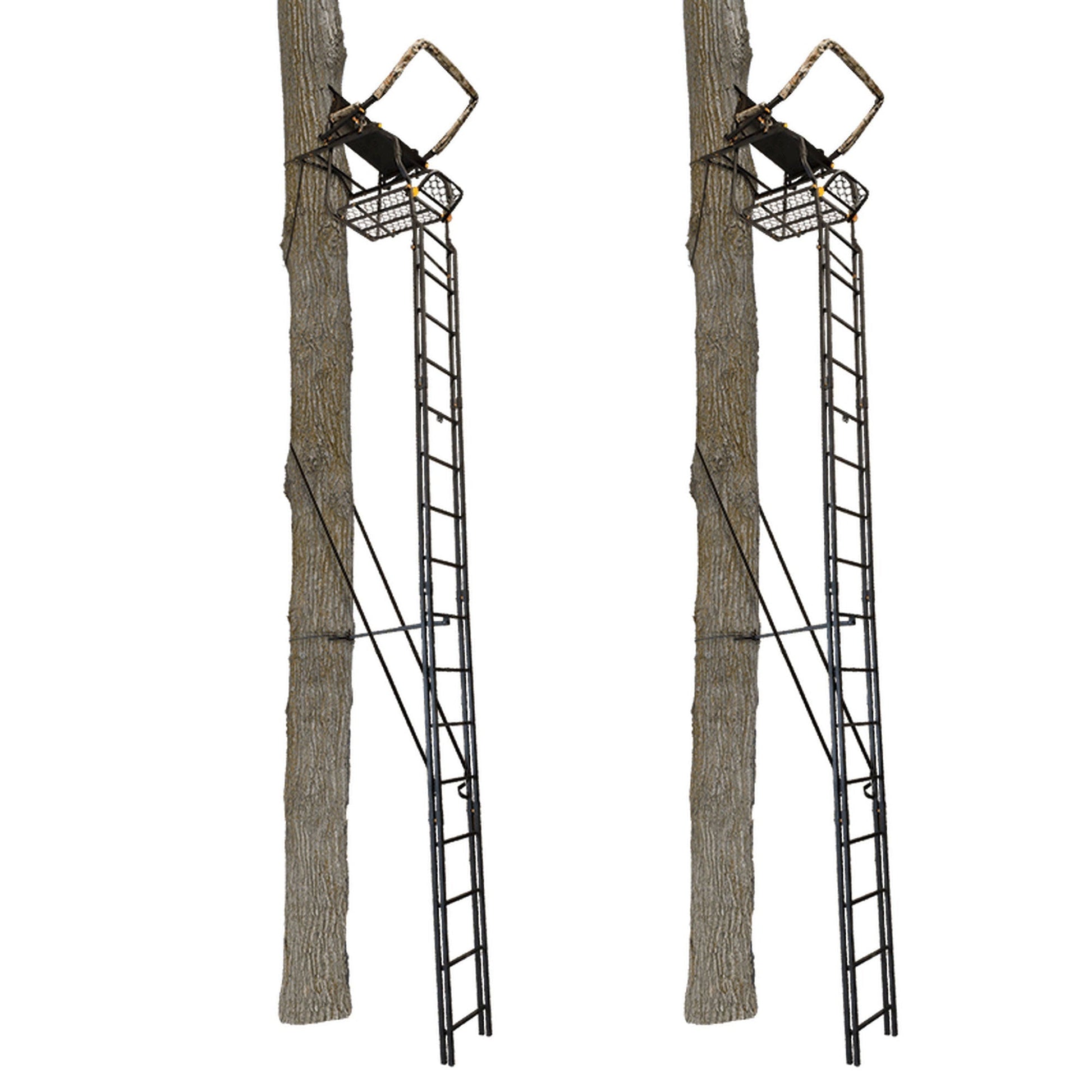 Bag the big game on your next hunting trip while you sit far above your prey on these 2-pack Muddy The Skybox Deluxe 20-Foot Tall 1 Person Hunting Deer Ladder Tree Stand with Flip-Up Adjustable Shooting Rail and Flex-Tek Seat to stay out of sight and hearing of deer and other big game.