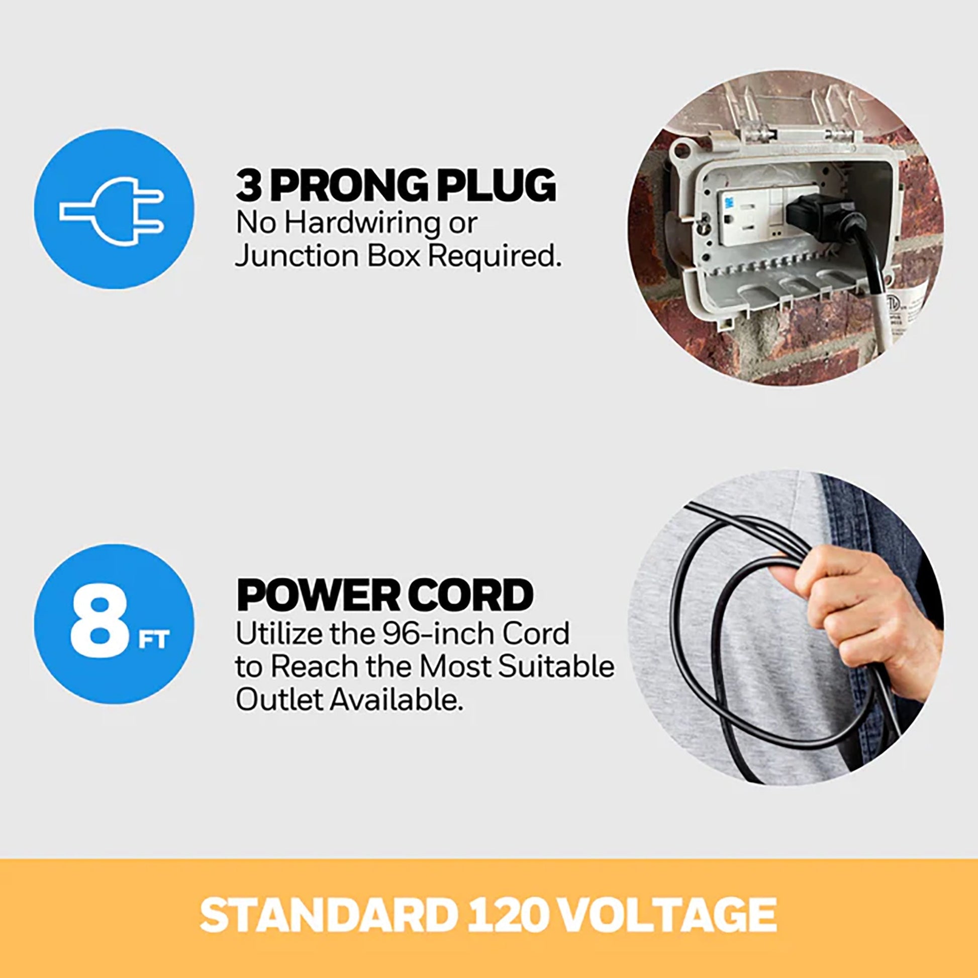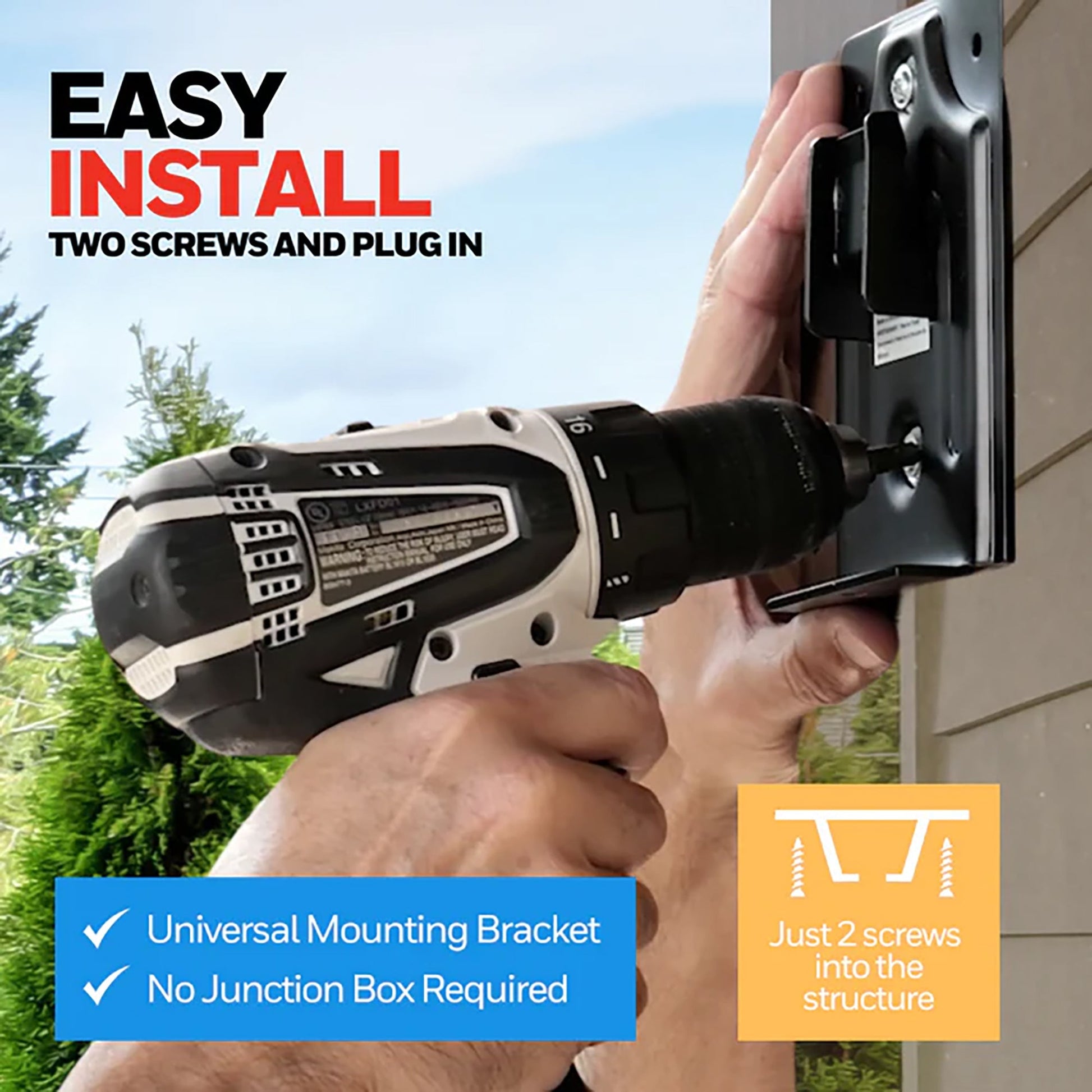 - Mounts securely to any wall or post using just two screws; includes an 8-foot power cord—no hardwiring required