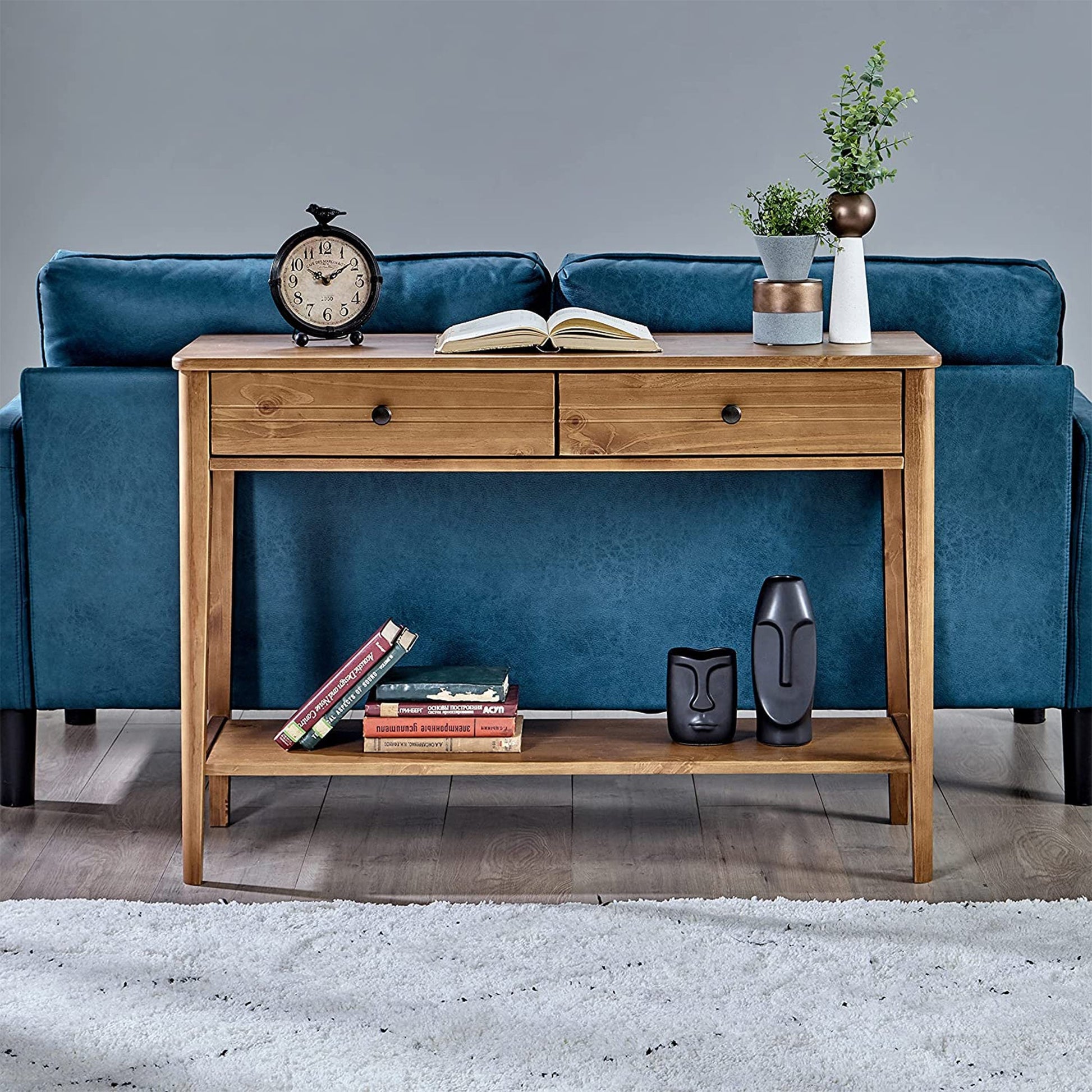 This solid wood 2-tier console table provides a durable base to display vases, books, table lamps, or other decorations in living rooms and entryways. Store away remotes, magazines, or other small objects in the 2 front drawers to keep things out of sight. A honey brown finish makes this table look great and blend right in with any existing room decor and furniture. Measuring 43.31 inches long, 14.96 inches wide, and 29.92 inches tall, this California table will make a great addition behind freestanding couches, dining rooms, or anywhere else you need extra storage and decor. Assembly is easy with included instructions and accessories and can be done all by yourself.