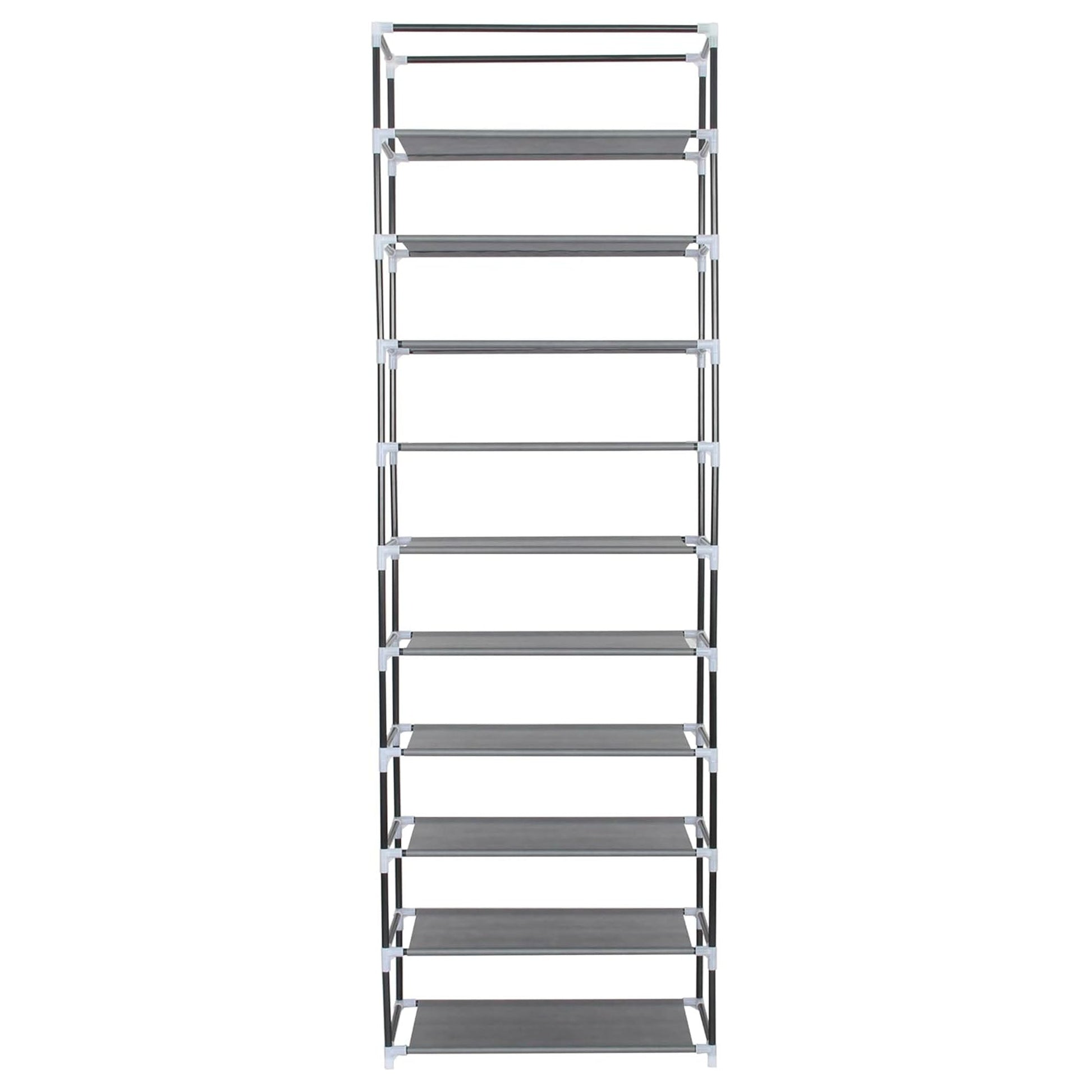 - Vertical 10-tier shoe rack stores various shoe styles and maximizes floor space