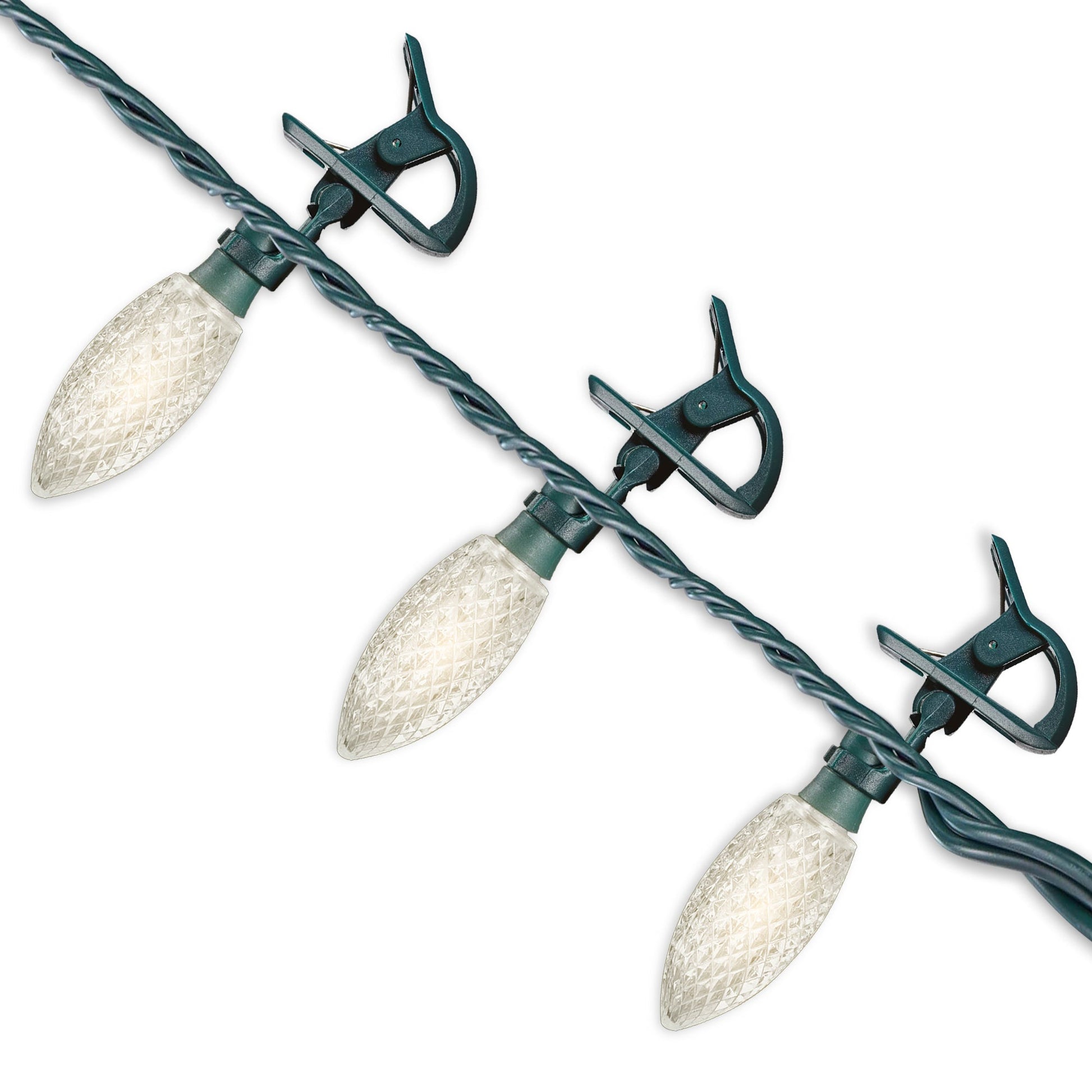 Create a festive and bright atmosphere this holiday season with the Quick Clip String Lights of warm white LED lights. Designed for convenience, the Quick-Clip technology allows you to decorate your home in half the time, eliminating the need for nails and staples. The spring-loaded clips securely attach to rooflines, branches, and railings, while the high-quality C9 bulbs rotate 180 degrees so you can easily adjust each light to your desired position.