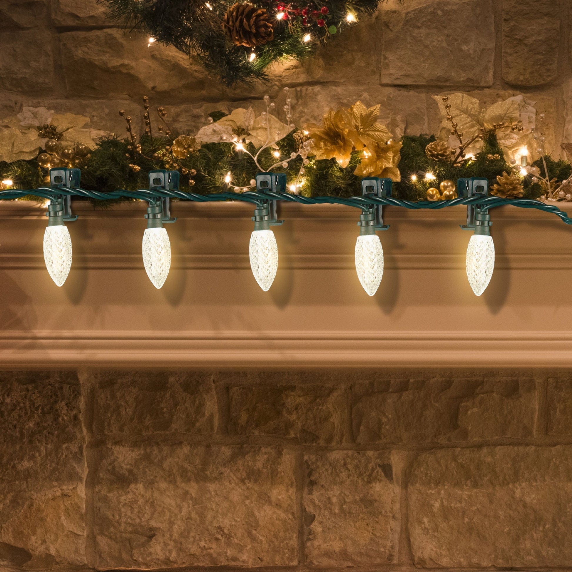 Featuring 100 energy-efficient LED bulbs, these lights not only add a warm, festive glow to the outside of your house, but are also built to last up to 10,000 hours. The faceted diamond-cut bulbs with weather-sealed sockets are perfect for both indoor and outdoor use, withstanding harsh winter conditions. with 8-inch spacing between bulbs, this lighted string provides ample coverage to ensure your home looks radiant throughout the holiday season. The green wire blends seamlessly into foliage and surrounds to ensure your holiday decor will look neat and professional. Enjoy decorating your home every holiday season with the Quick-Clip String Lights.
