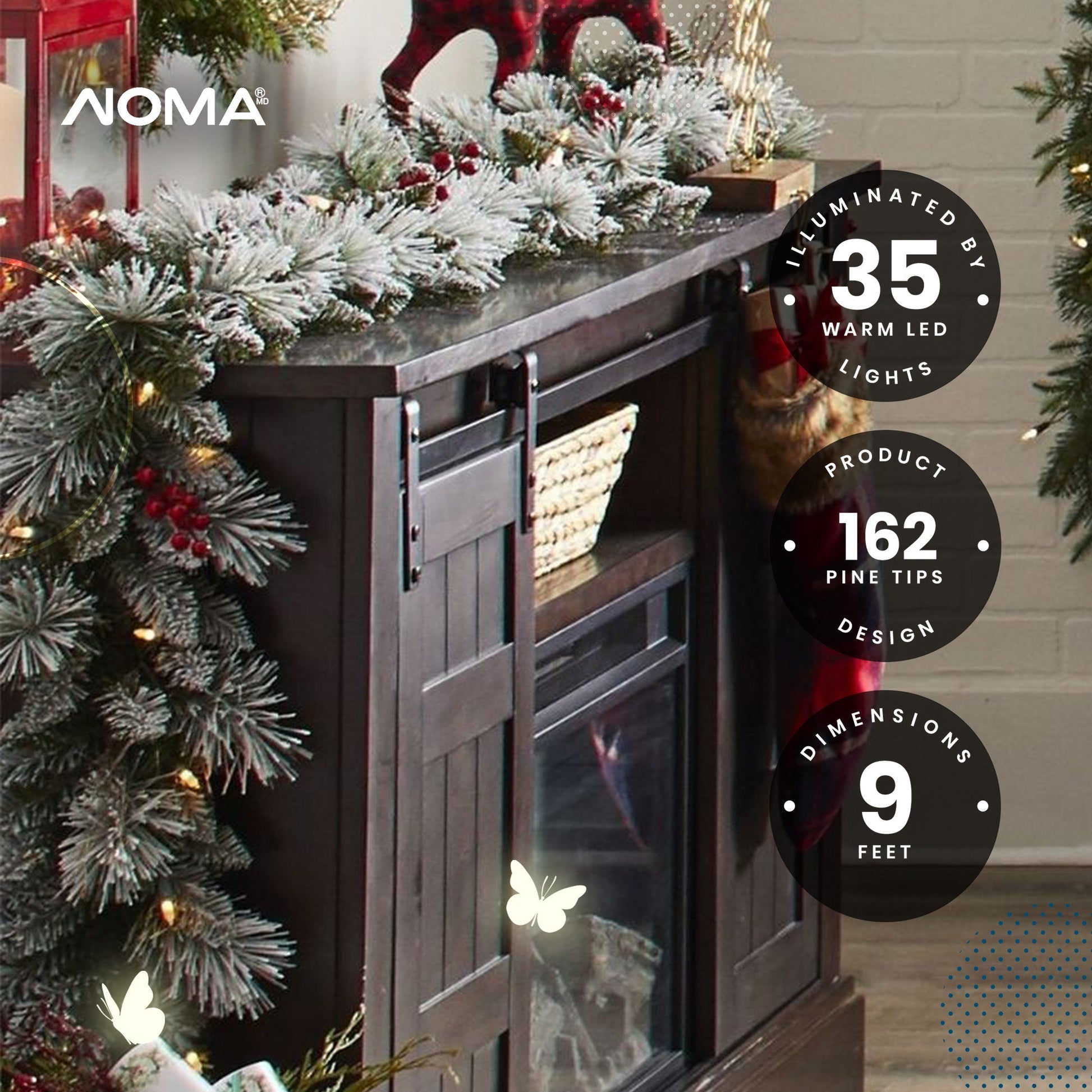Enhance your holiday ambiance with the NOMA Pre-Lit LED Flocked Berry Christmas Garland. This exquisite flocked Christmas garland is designed to elevate your seasonal decorations with its realistic appearance and warm illumination. It is 9 feet long and generously adorned with 162 PE and PVC snow-dusted pine needles, creating a lush and full-bodied look that instantly brings the spirit of Christmas into your home. The durable design also includes mini frosted pinecones and berries for a charming touch of nature-inspired elegance.