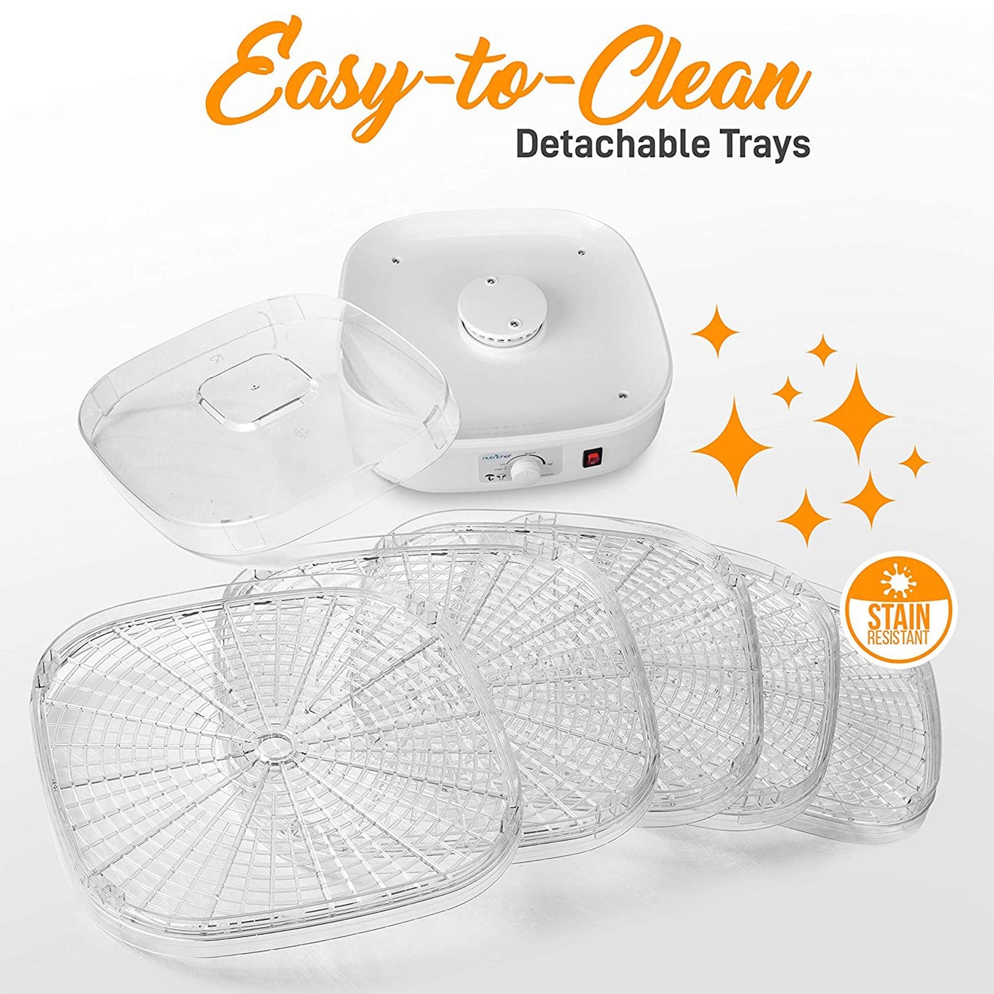 - Adjustable temperature control knob to fine-tune the heat needed for preparing different healthy, dried snacks