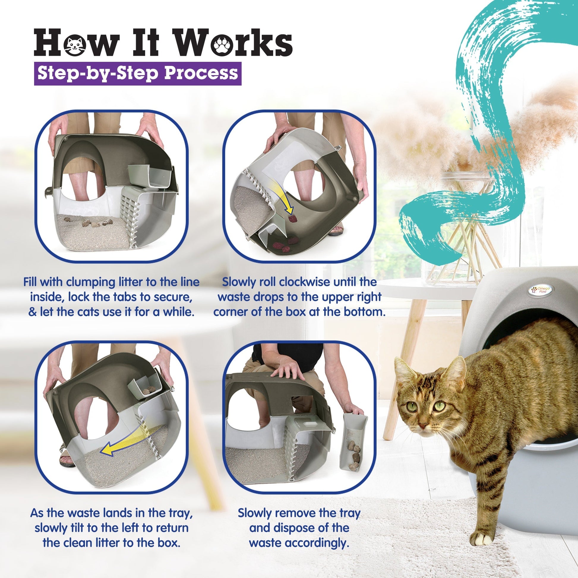 - Waste collects in the included pull-out tray for easy, scoop-free cleanup