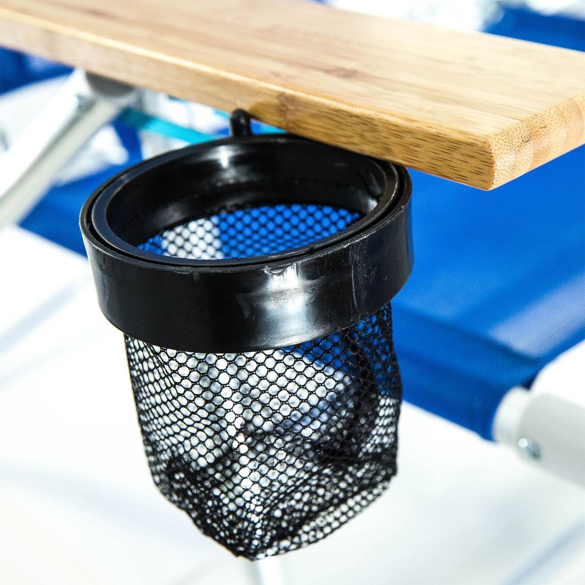 - 3N1 beach chair with 5 adjustable chair positions and 3 adjustable foot-rest positions, sits 12 inches high off the ground, has a carry strap for easy transport, and a built-in cup holder for added convenience