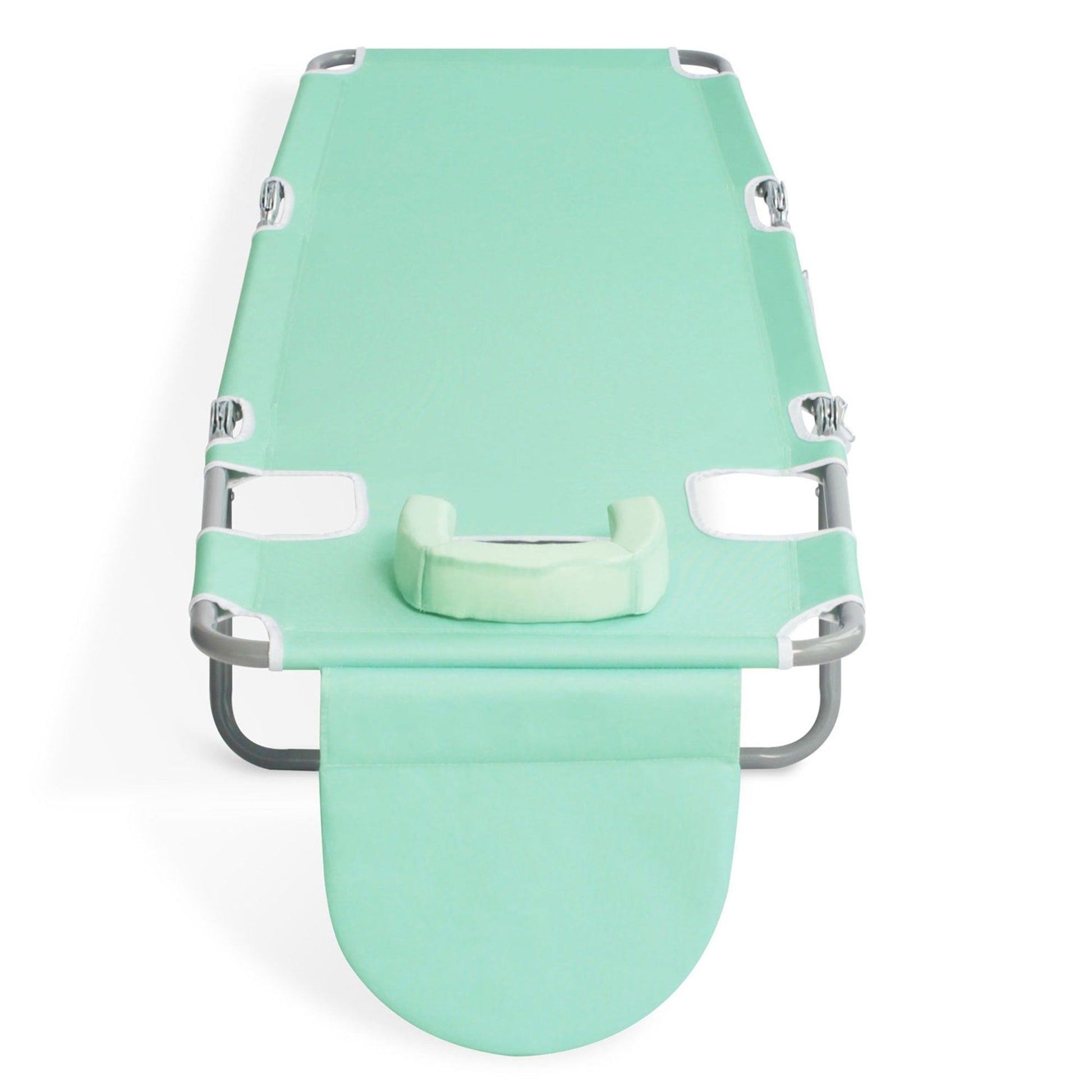Featuring an open-and-close face cavity with armholes for breathability, you'll be able to achieve a comfortable position for a relaxing day of sun. Customize your comfort with 4-position options to recline or lay flat. Simply fold down and pick up the carrying straps you're ready to go, allowing you to have your hand free to tote your other necessities. These tanning loungers are constructed of powdered steel, support up to 250 pounds, and show off a soft teal color fabric made of durable polyester.