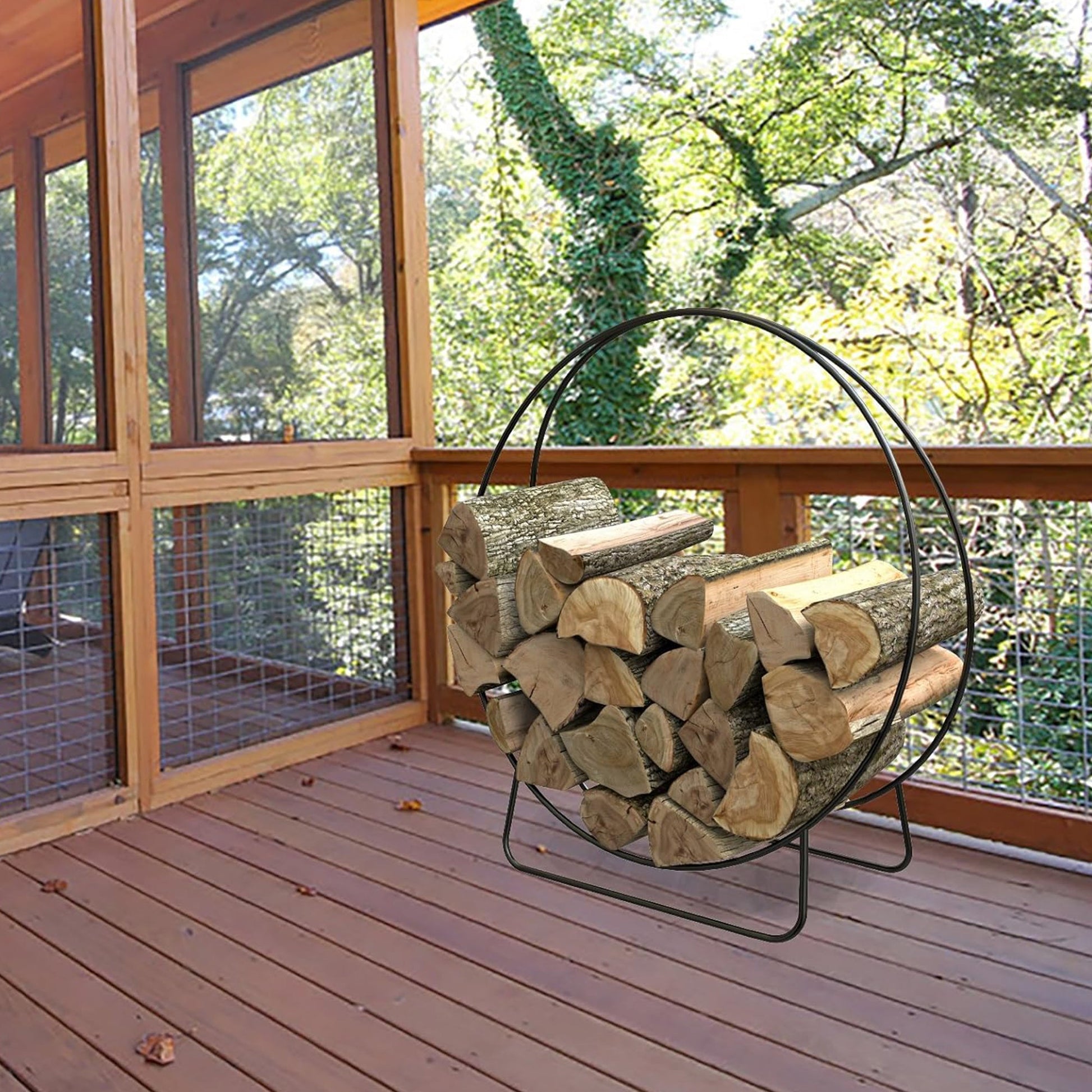 - With its 40-inch height and hoop-style design, neatly stack and store firewood indoors or outdoors, keeping it clean, dry, and readily accessible
