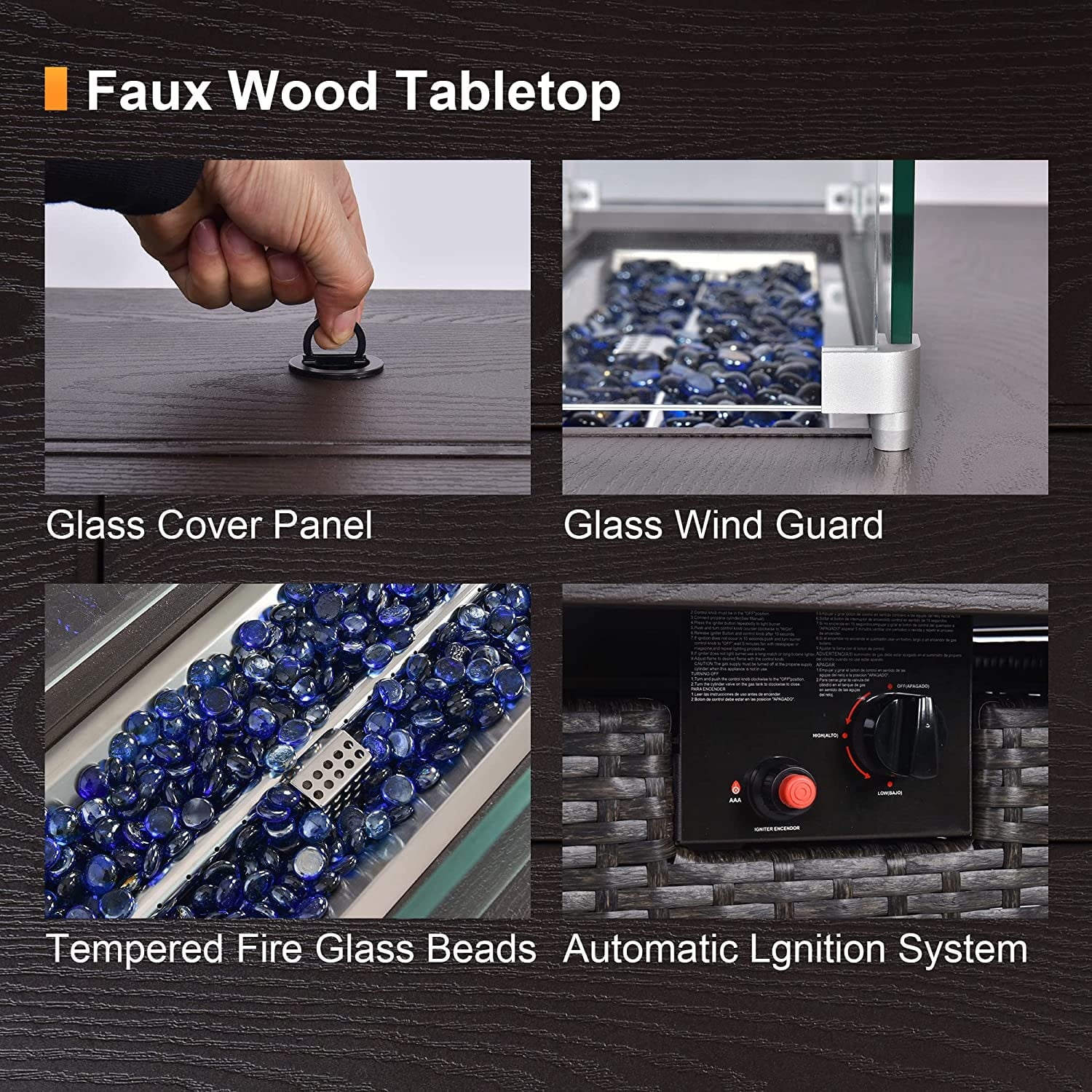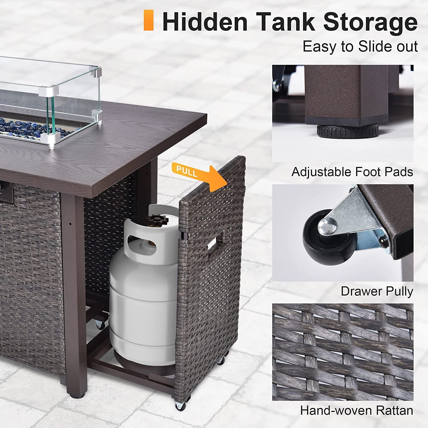 Phonjoroo Fire Pit Table 42 in Outdoor Propane Gas Fire Pit for Outside 50,000 BTU Auto-Ignition Gas Firepit Outdoor Rattan Table with Glass Wind Guard and Cover