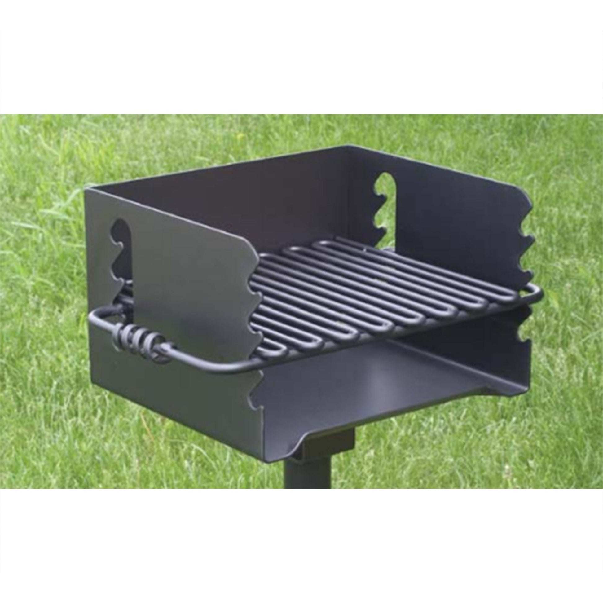 - Heavy-duty park-style solid steel grills and stands with adjustable features for outdoor charcoal cooking