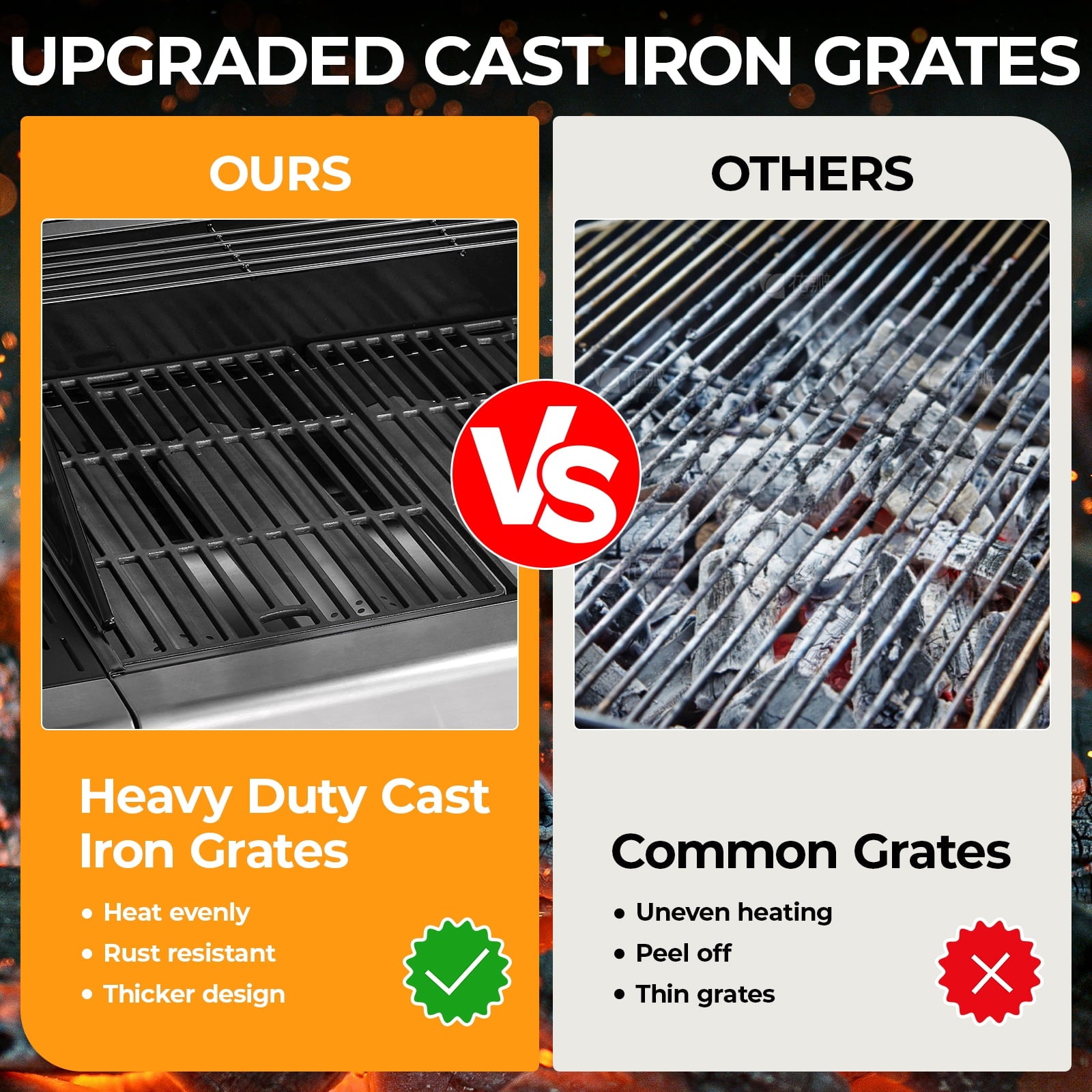 4 stainless steel burners, 4 galvanized plate flame tamers and cast iron cooking grates distribute even heat across the entire grilling surface, preventing hot or cold spots on grates.
