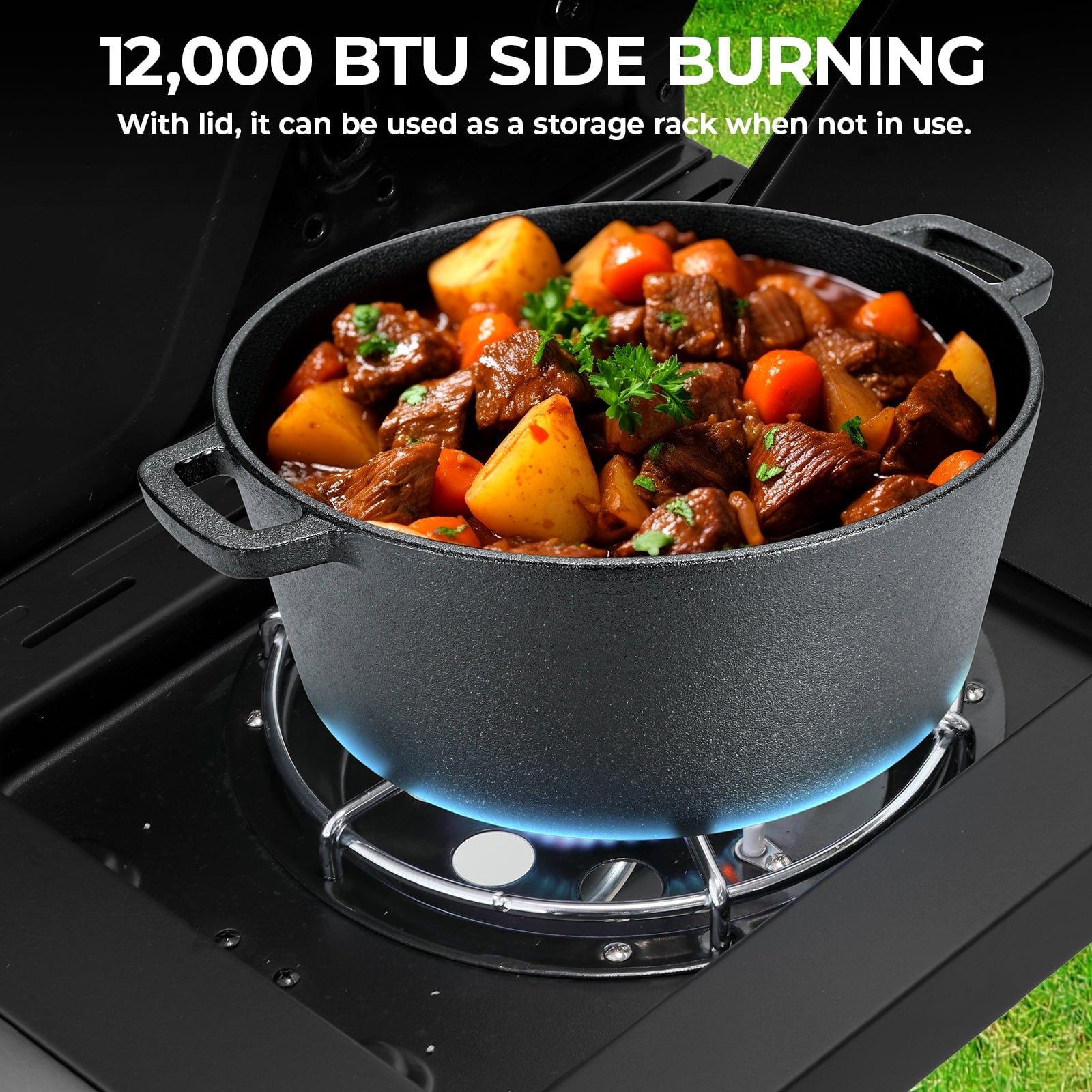 4-Burner Barbecue grill features a 414 sq.in cast-iron main cooking area, a 91 sq.in enameled grill auxiliary cooking area and a 260 sq.in cooking preparation area. The large cooking area also allows you to cook different types of food at the same time, making it perfect for barbecue parties with friends and family.