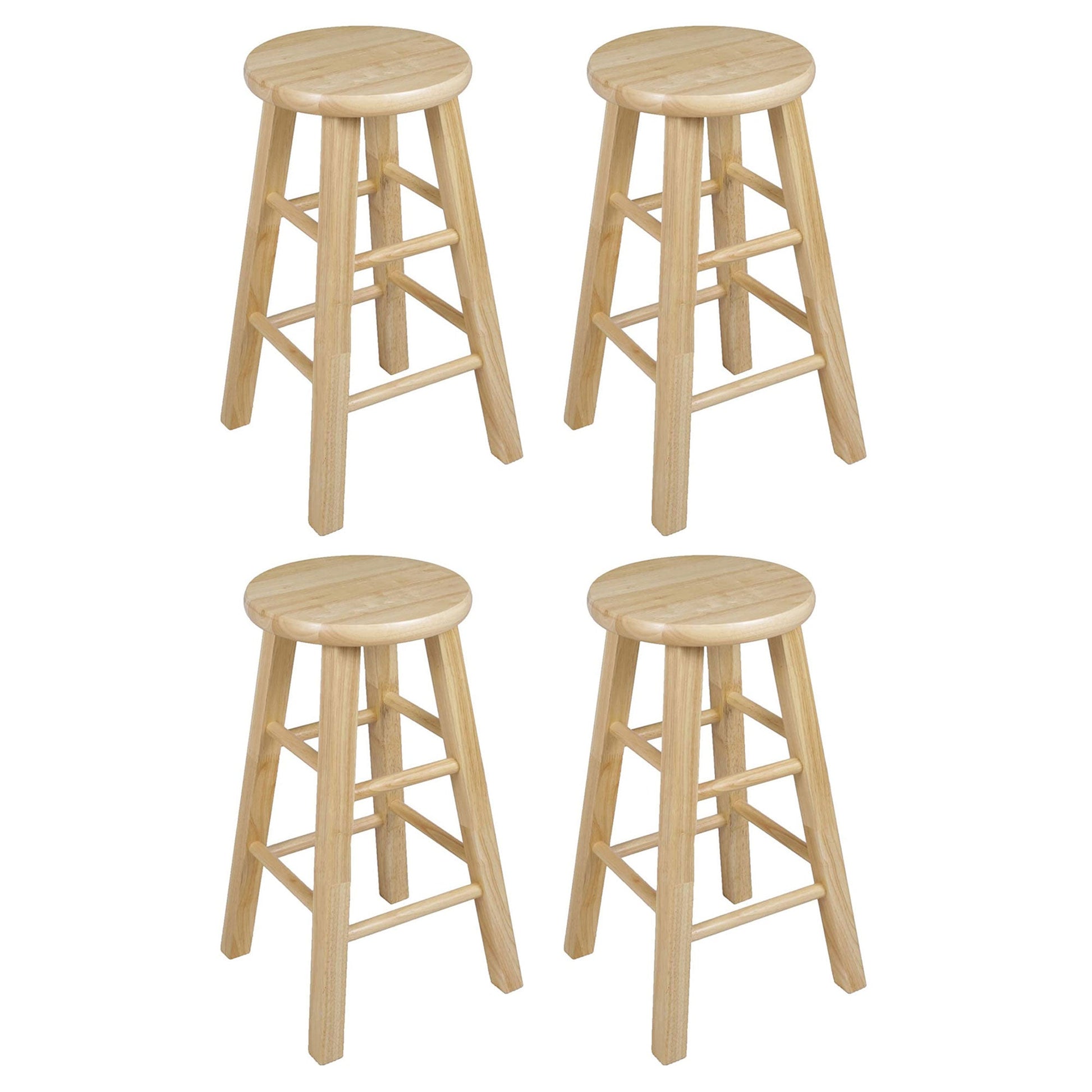 These stools are ideal for all occasions, whether paired with a small dining space that you already have, adding seating to your countertop, or casual entertaining space. Constructed from sturdy, durable wood, this set of 4 bar stools feature comfortable, round, backless seats that stand 24 inches high, with a classic and modern design that fits in with any existing decor. With 4 well-balanced, square legs, along with 8 built-in bars for your feet, each stool can withstand up to 225 pounds. Good for eating, working, entertaining a few guests, or just sitting around, these stools are a great addition to that new bar, counter height table, or working area. Light assembly is required before you can use these bar stools, with all required hardware included.