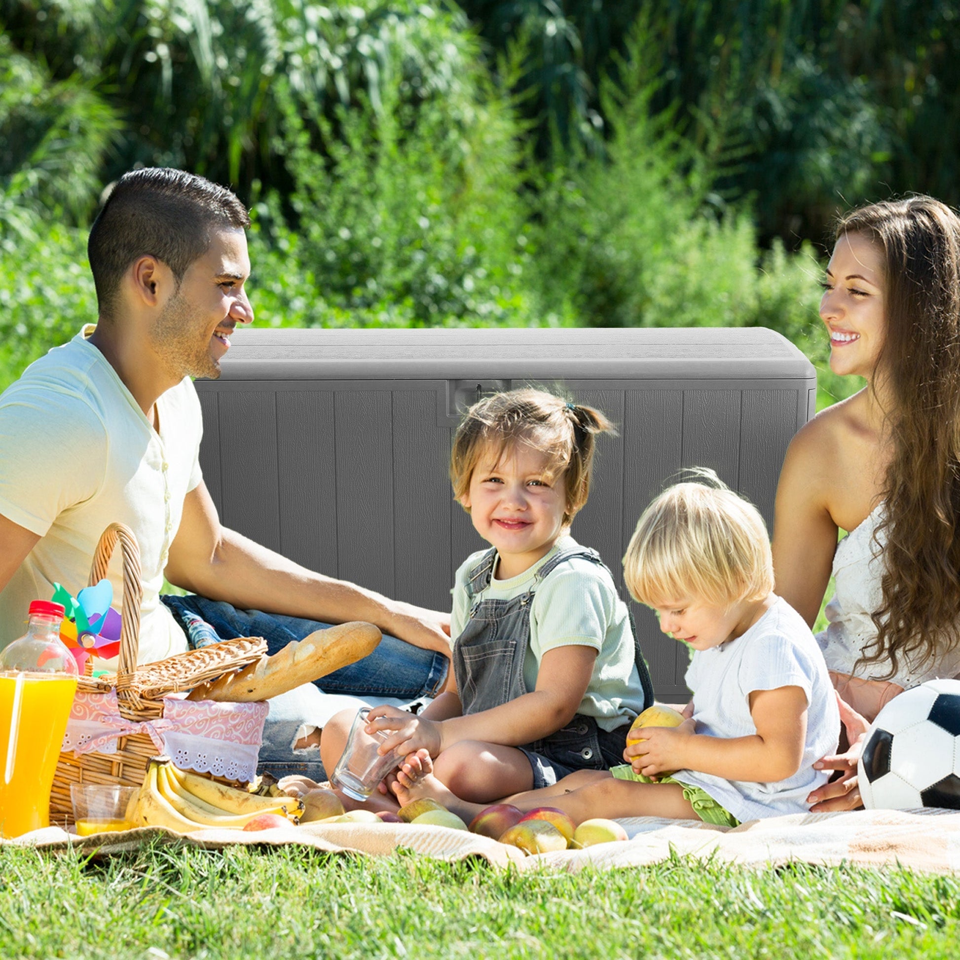 This outdoor storage box can be situated comfortably on your deck, in your backyard, near your shed, or anywhere else. Designed with a double-wall plastic construction, the deck box has a molded lid and lid retainer straps, ensuring that your belongings will always stay secure. The outdoor container is resistant to harsh weather conditions and has a unique, attractive wood-like pattern that will allow it to fit in with any existing furnishings.