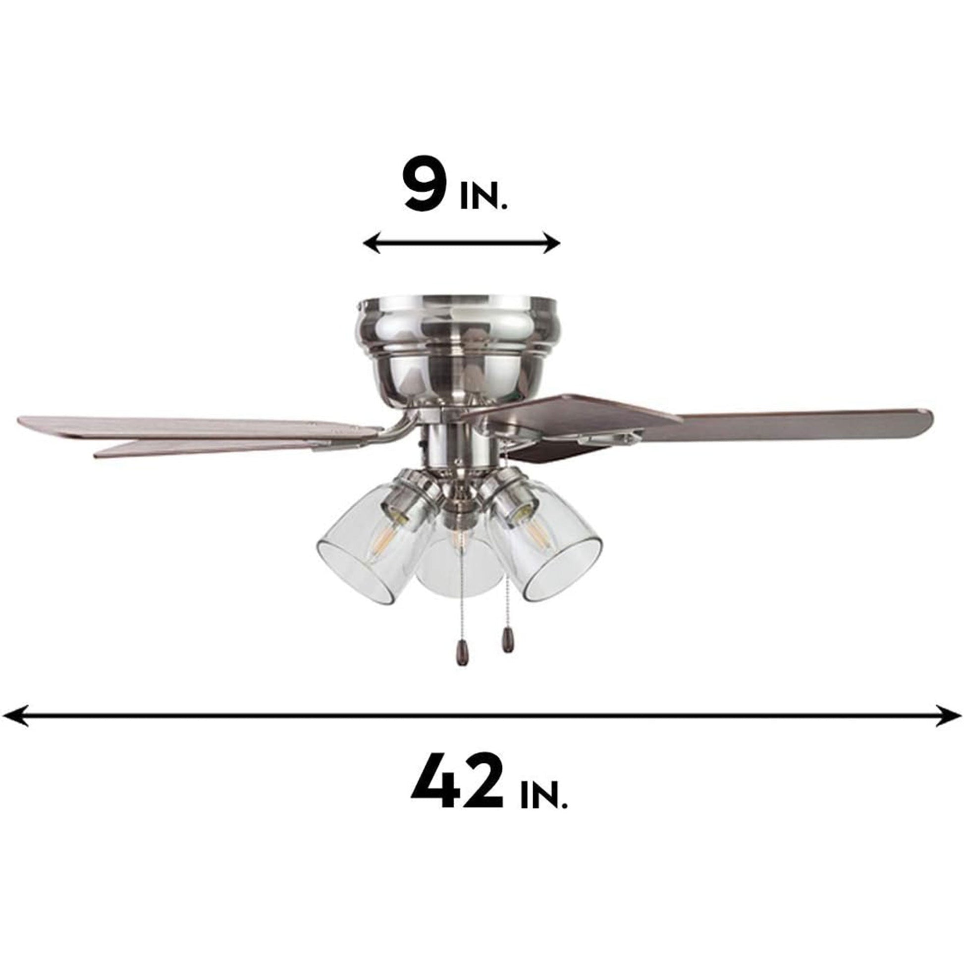 With a pull chain control for easy operation, this fan is crafted from a combination of wood, glass, and metal in a sleek brushed nickel finish. The fan measures 42 inches long, making it a compact and stylish solution for medium-sized rooms. Installation can be completed in 45 to 60 minutes.