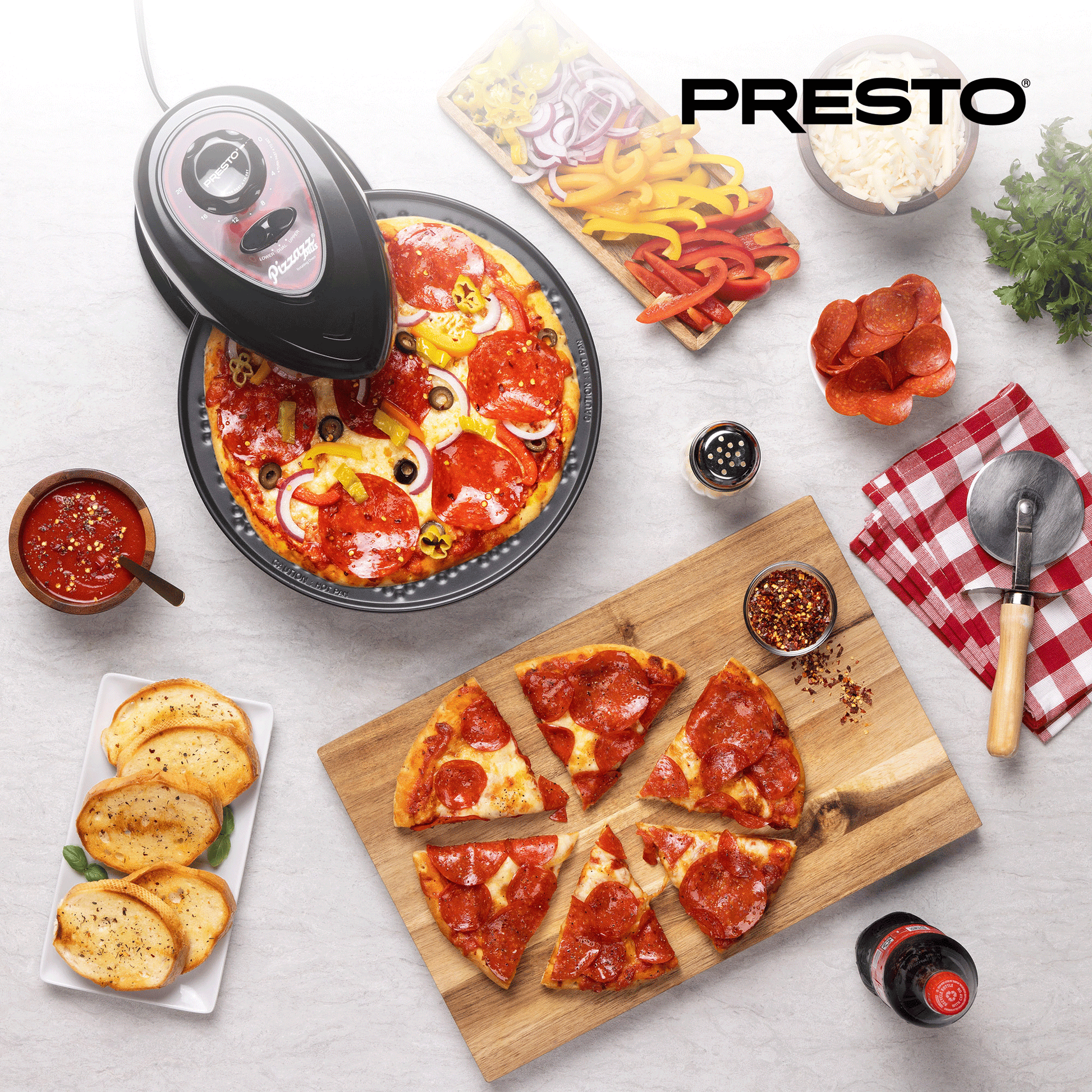 Elevate your home-cooked meals and save time and energy compared to a traditional oven. The Presto Pizzazz Plus Rotating Oven is the perfect kitchen companion for busy weeknights, weekend gatherings, and everything in between. Bring the taste of a professional pizzeria right to your own kitchen with this versatile and user-friendly appliance.