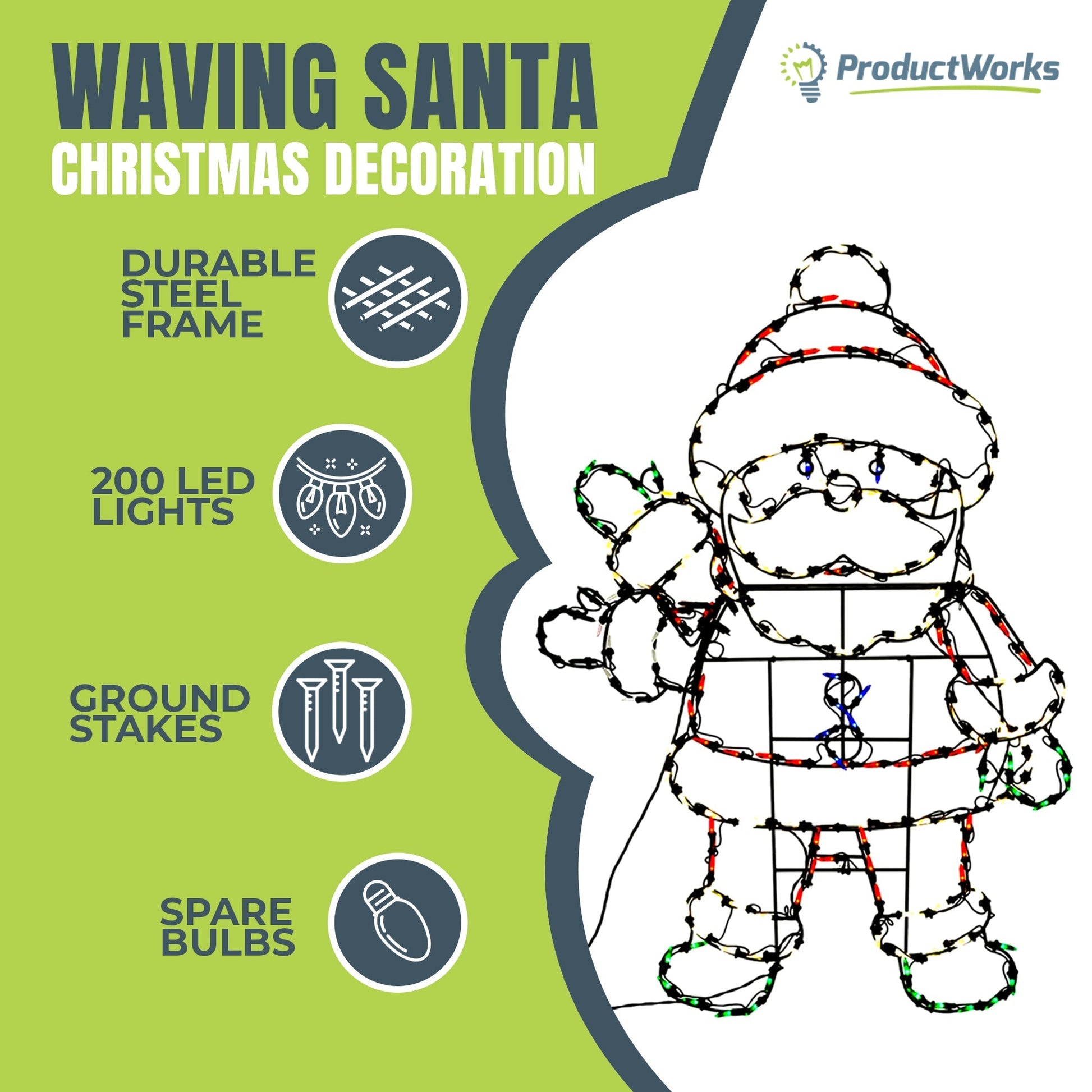 - Santa features 200 multicolor LED lights that blink to show the Santa waving hello and illuminate your surroundings with a warm, inviting glow