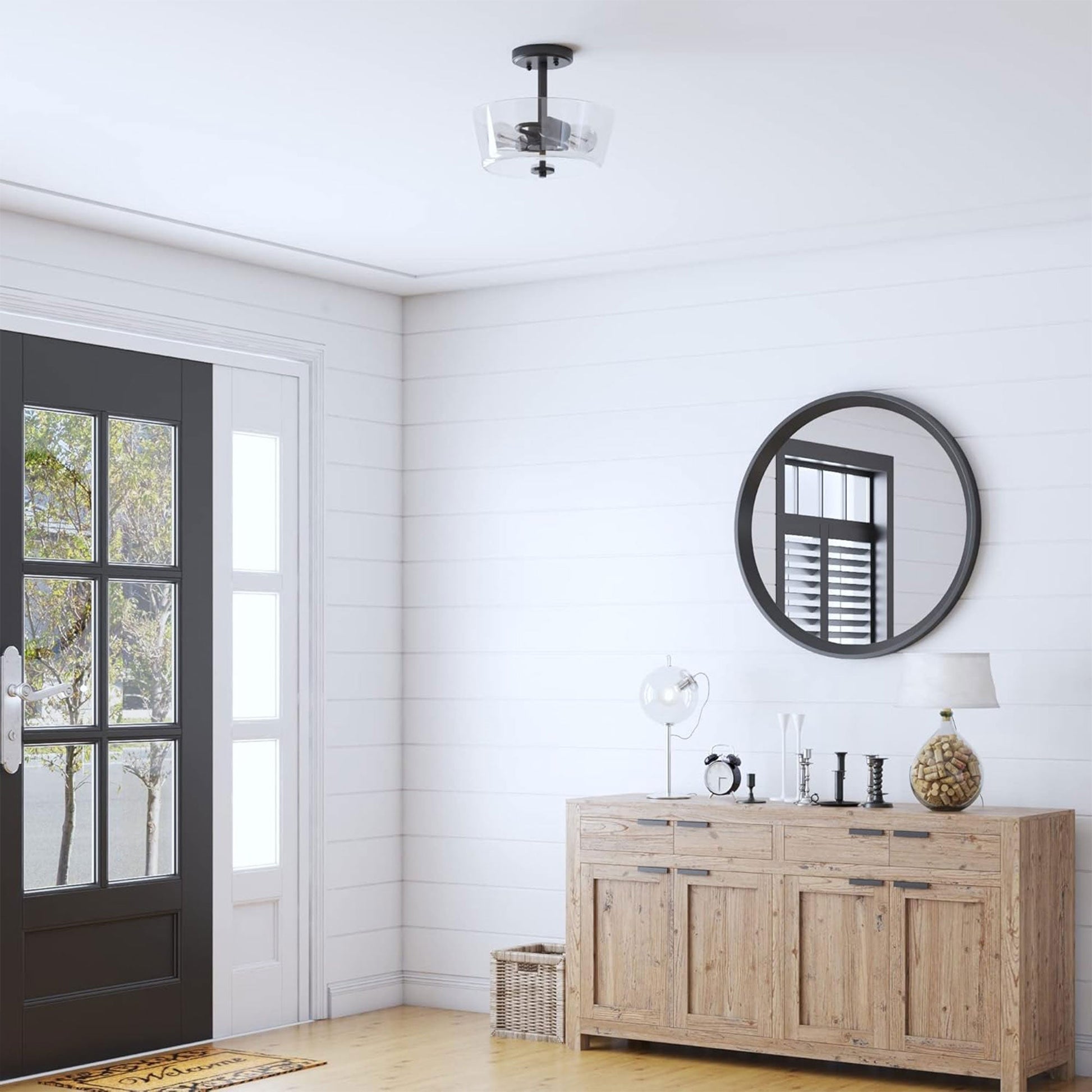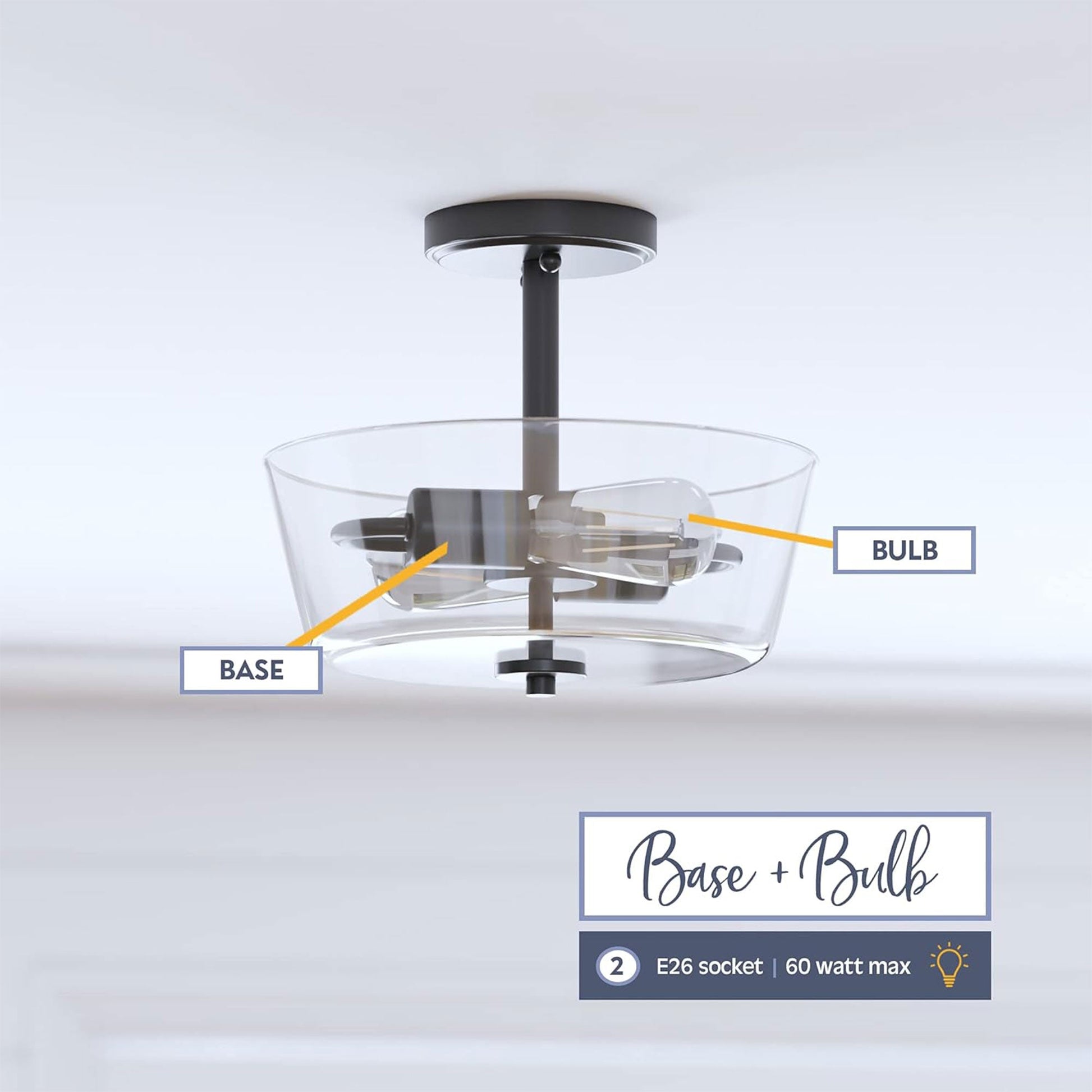 Ideal for areas where a low-hanging fixture might not be practical, this semi-flush mount design offers the visual appeal of a pendant without sacrificing headroom. It supports 2 medium base E26 bulbs, up to 60 watts each, allowing for ample illumination and bulb flexibility.