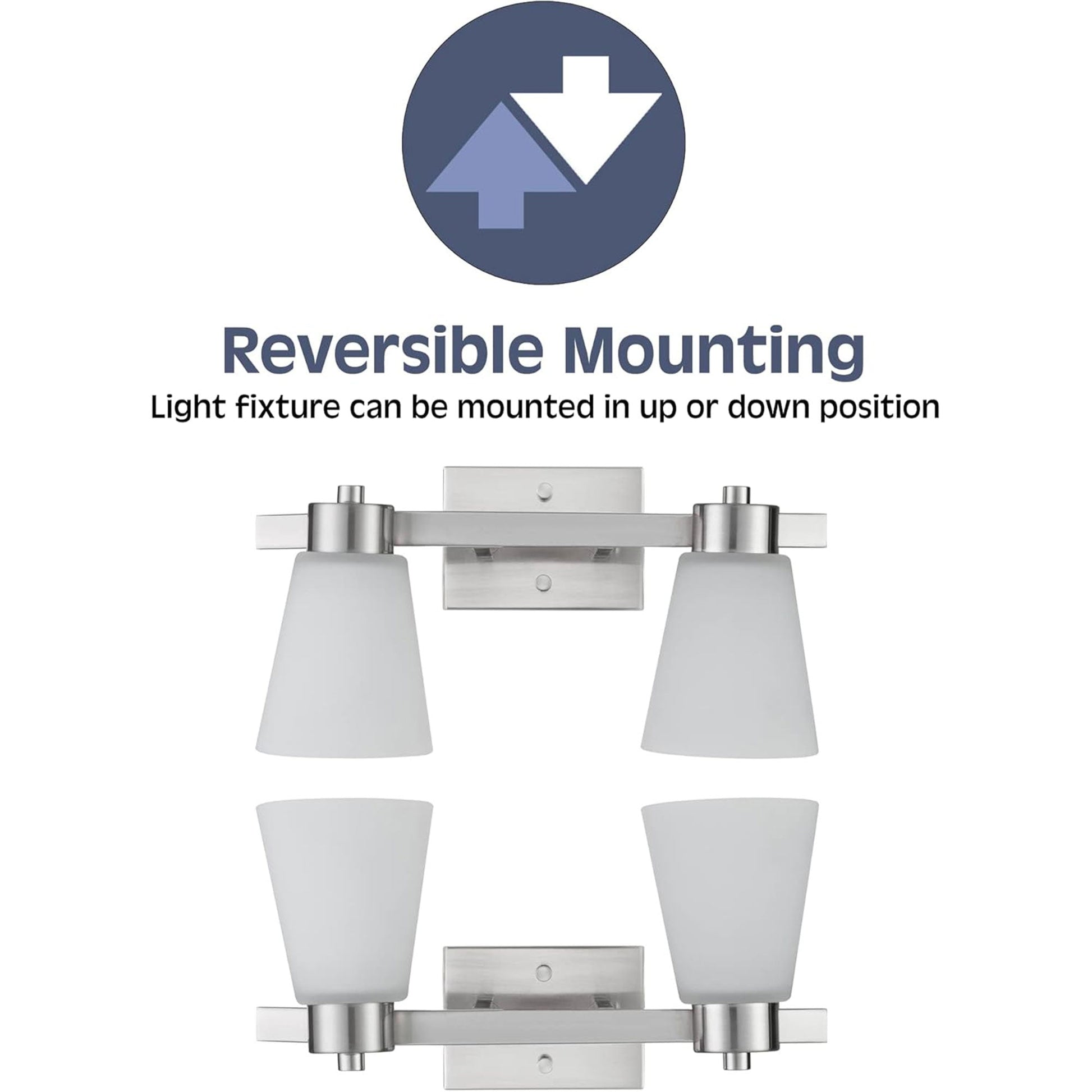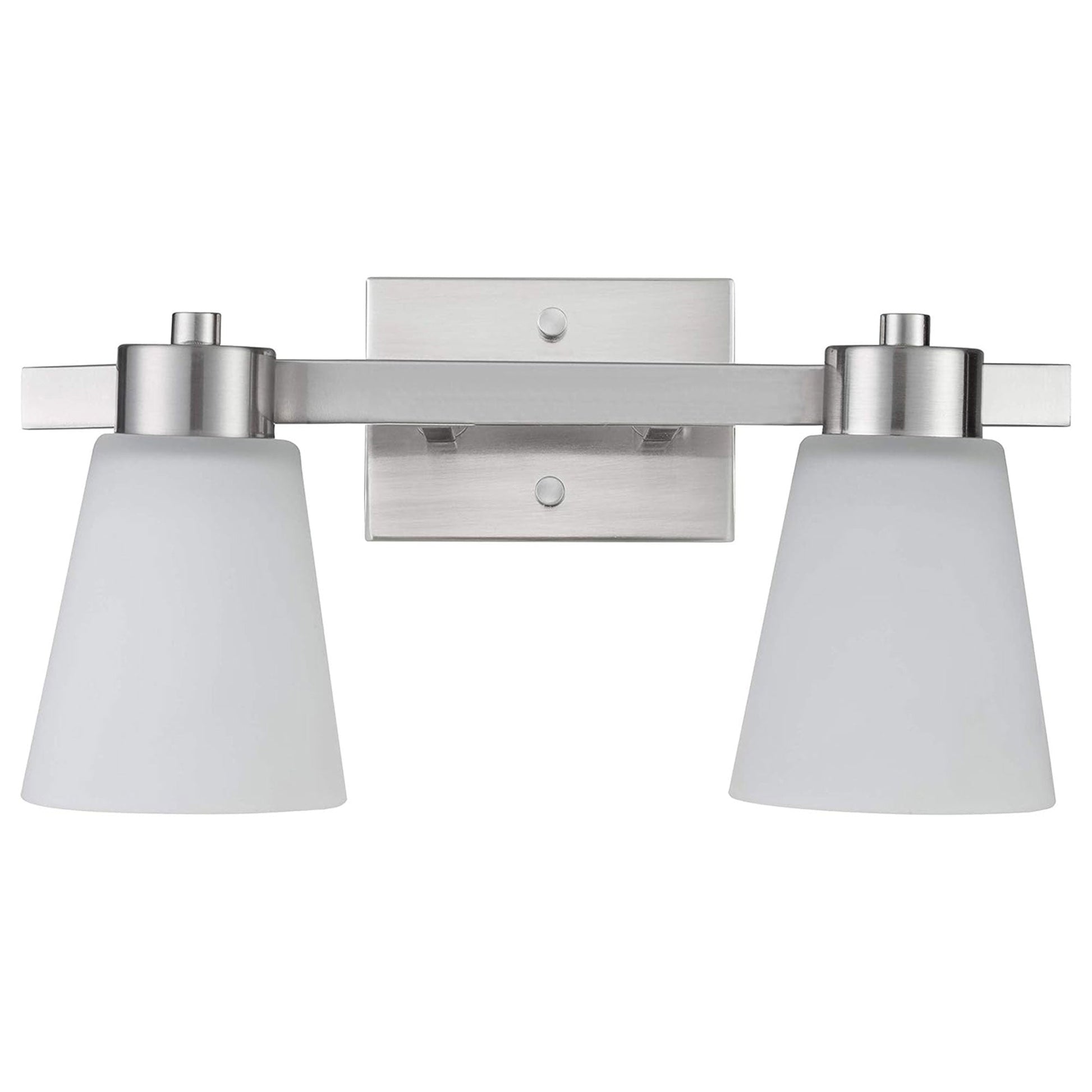 - Modern 2-light vanity fixture with frosted glass shades adds modern style to bathroom or bedroom spaces
