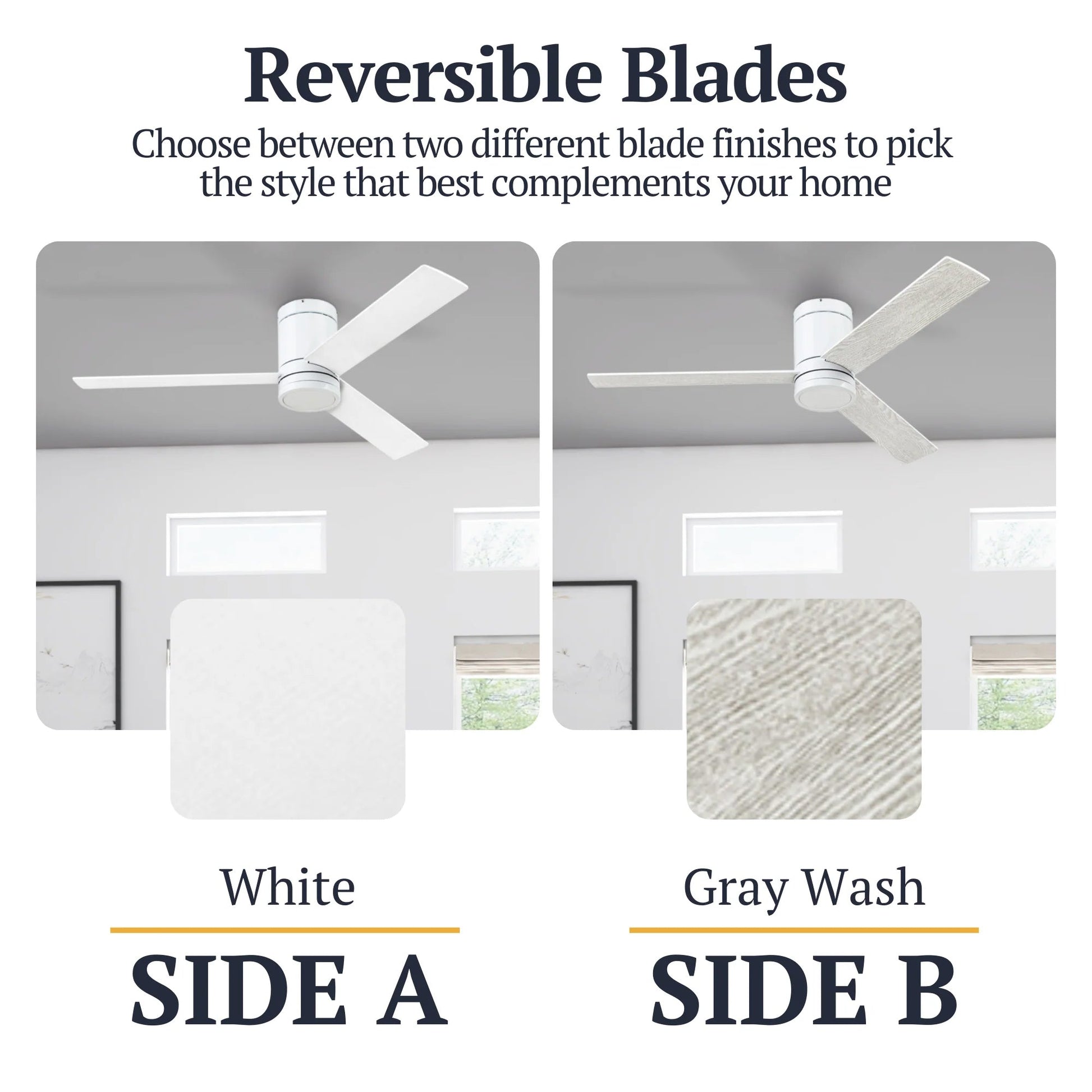 - Dual-finish blades in Burnt Oak and Iron allow for easy style customization to fit your space
