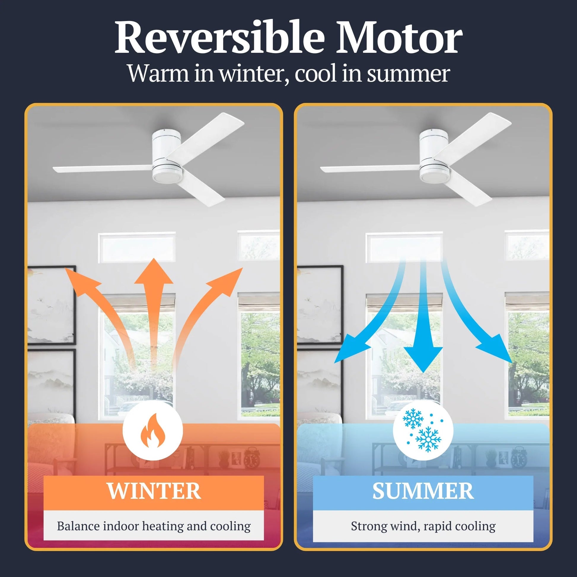 - Modern 52-inch flush-mount ceiling fan enhances airflow in medium and large rooms for added comfort