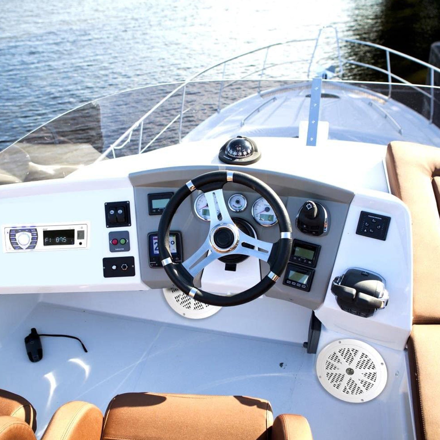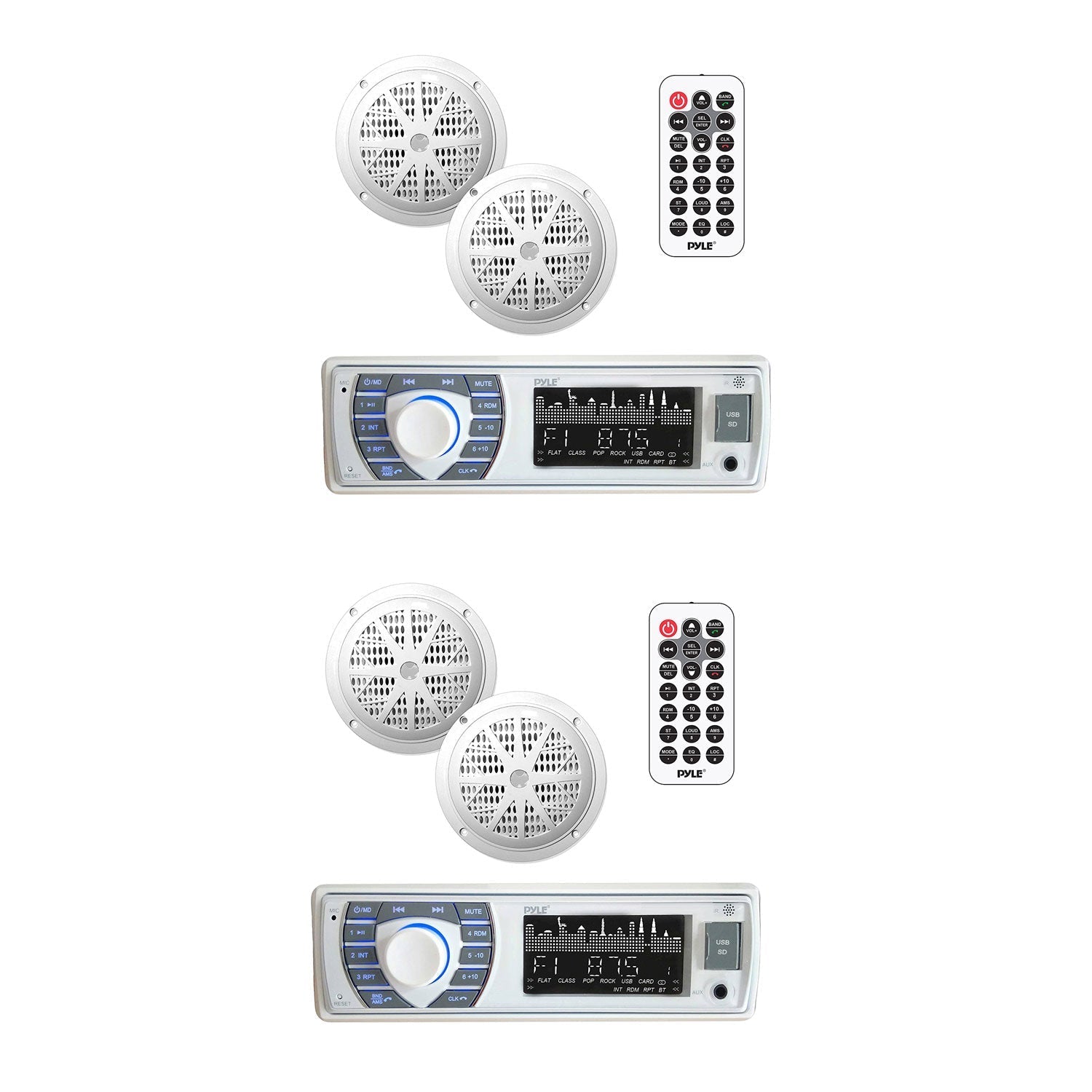 Each Pyle Bluetooth Marine Stereo Kit includes a radio receiver and (2) waterproof marine grade speakers. The kit's single DIN universal standard headunit comes loaded with features like built-in Bluetooth, AM/FM radio with 30 presets, USB flash drive reader, SD memory card reader -- along with an Aux (3.5mm) input jack. You will have the ability to connect and stream audio from all of today's latest devices (like smartphones, tablets and MP3 players).