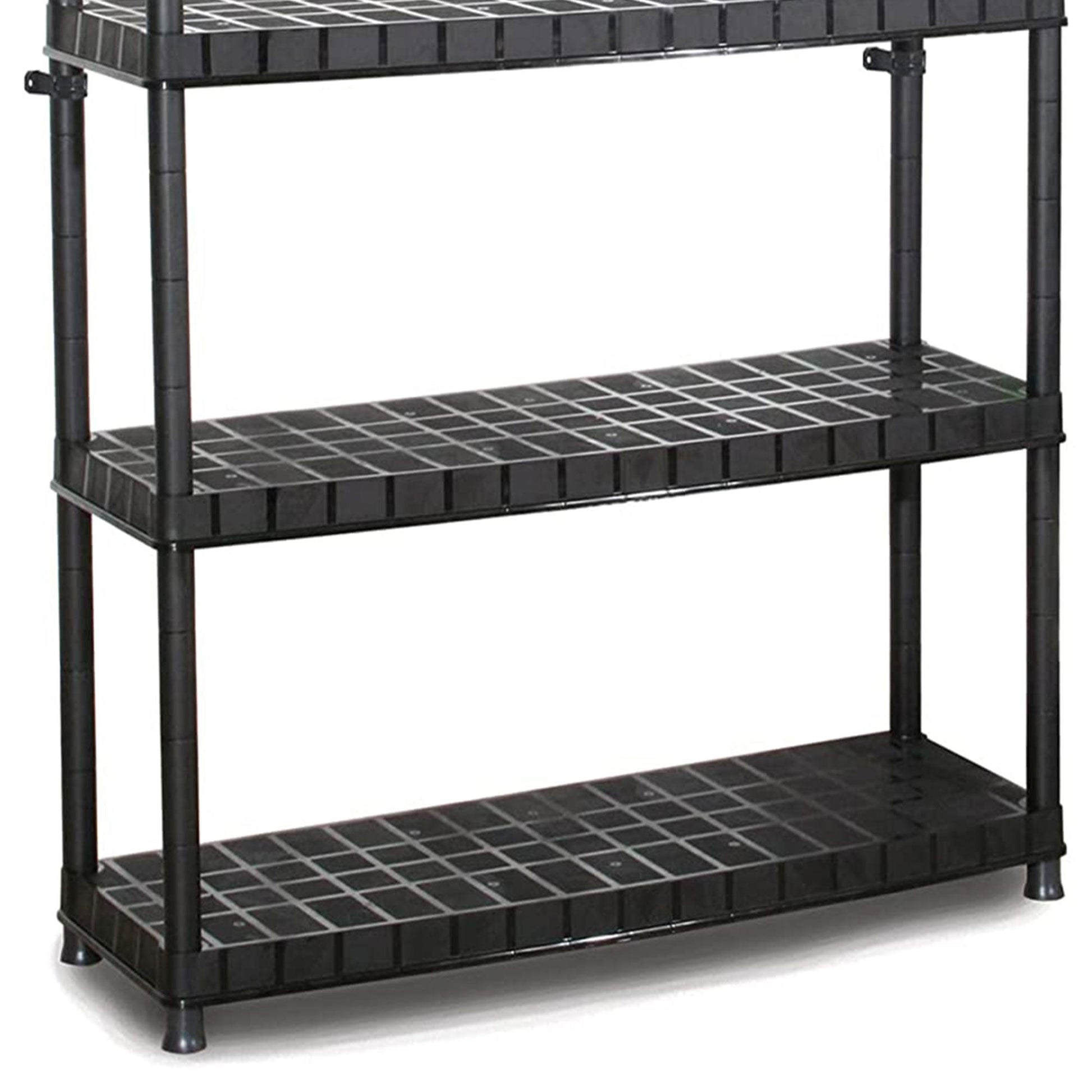 This durable plastic shelving unit consists can be placed in any room to provide additional storage spaces and make the most of your living space. The tube and panel systems can be adjusted to different heights by reducing or adding tiers. The simple, yet stylish black design is sure to mesh well with any room you need extra storage space.