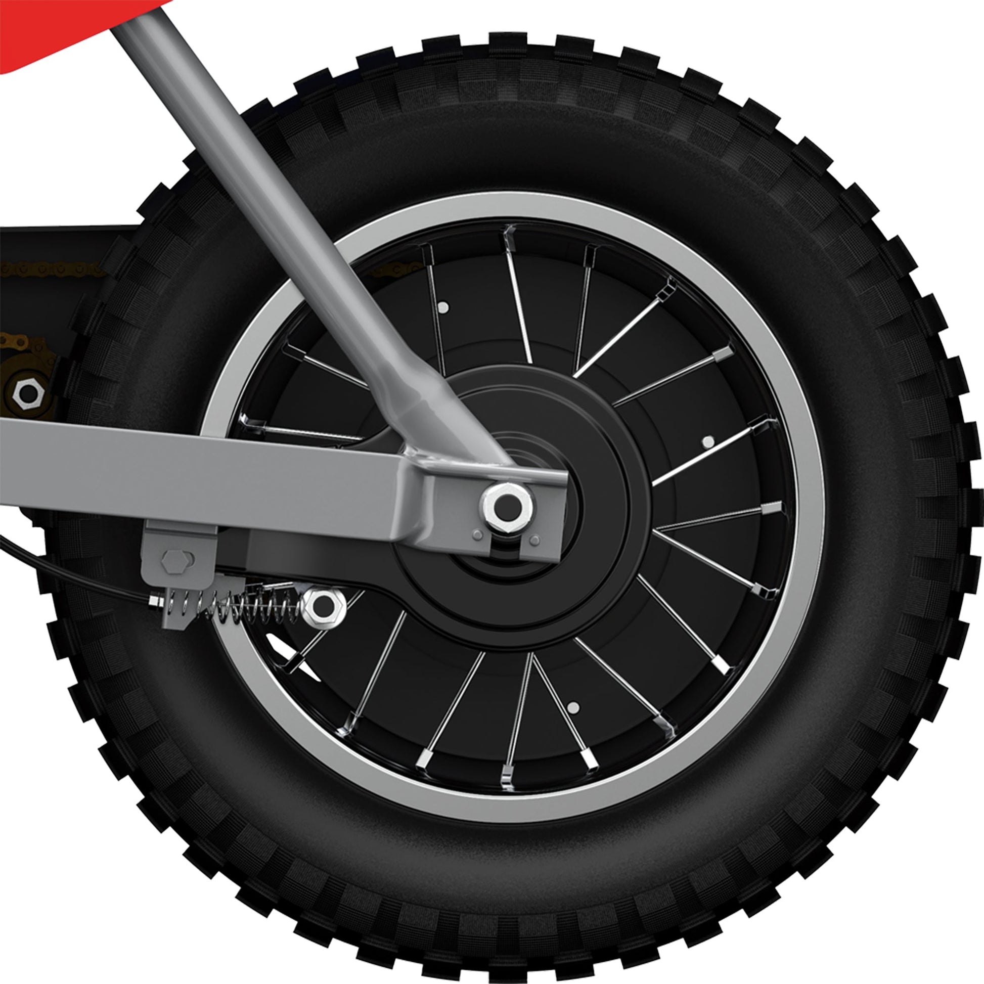 With a high-torque, powerful 350-Watt electric motor, large 12-inch pneumatic knobby tires for maximum power transfer, speeds up to 14 miles per hour, and up to 30 minutes of continuous use (up to 10 miles on a single charge), you'll be the king of the dirt hill.