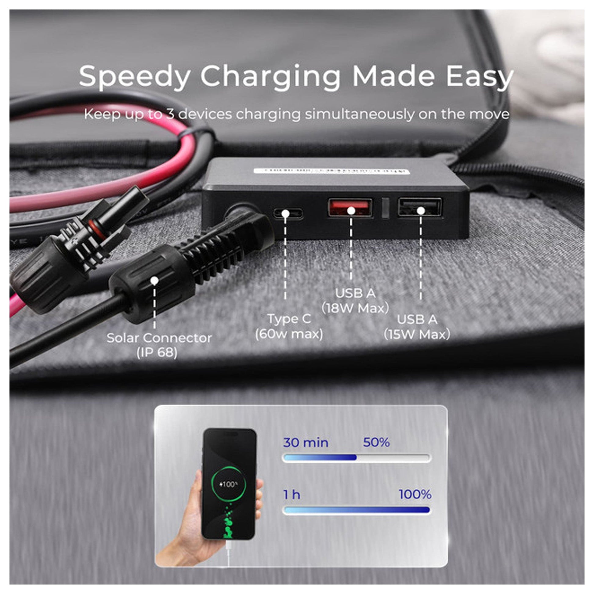 - Multiple Output Options: Featuring an industry-standard solar connector, a Type C port, and 2 USB A ports, this panel lets you charge multiple devices simultaneously, offering versatile charging solutions