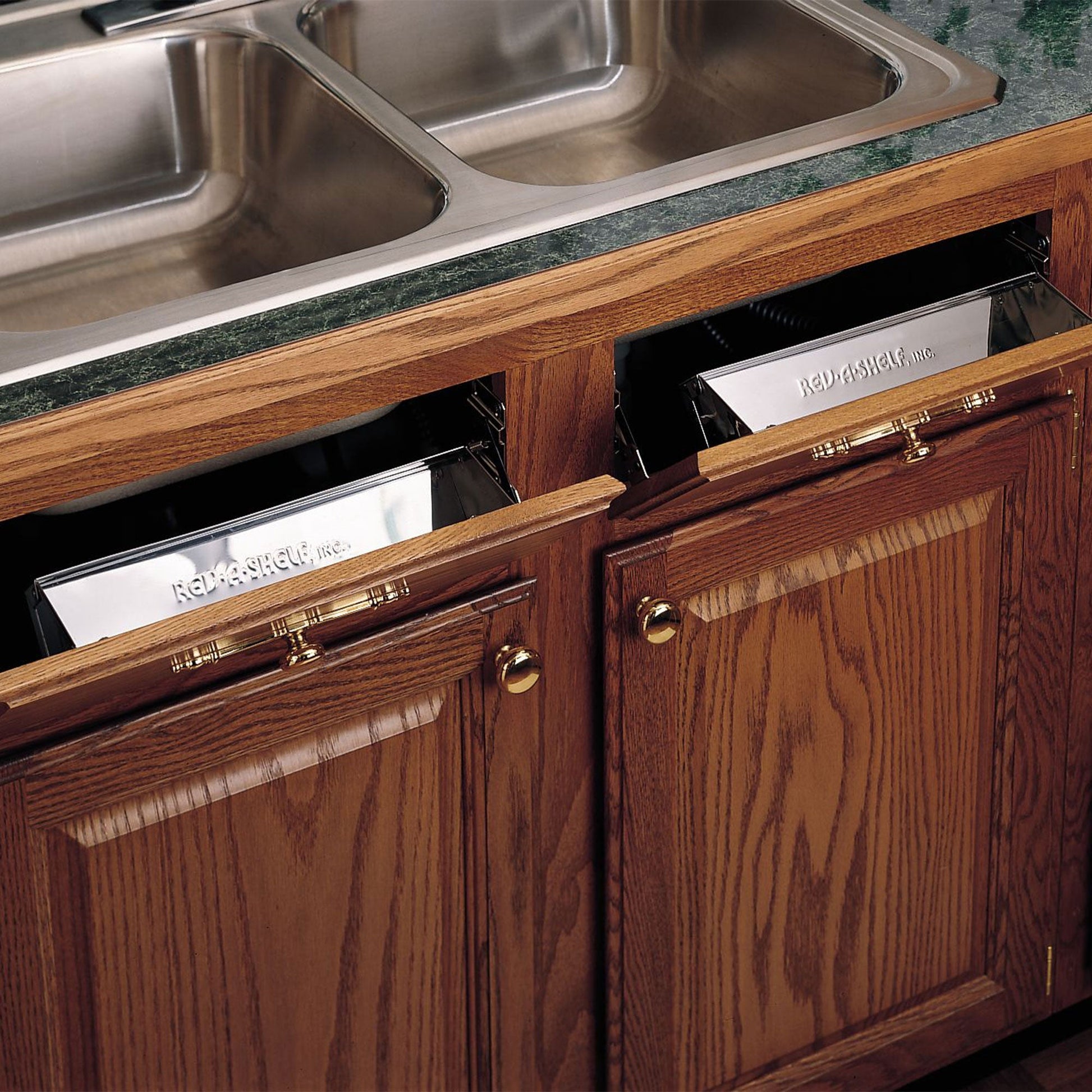 - Stainless Steel Tip Out Trays with Soft-close for Sink Base Cabinets to maximize space and efficiency in the space around sinks in your home