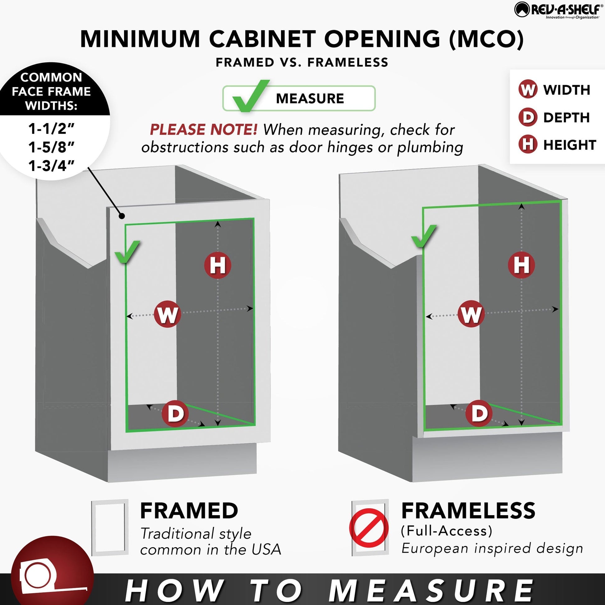 Double check your cabinet's opening to allow the best fit. Measure side to side, front to back, and top to bottom. Double check to make sure your product is within measurements and don't forget to take into account any obstructions.