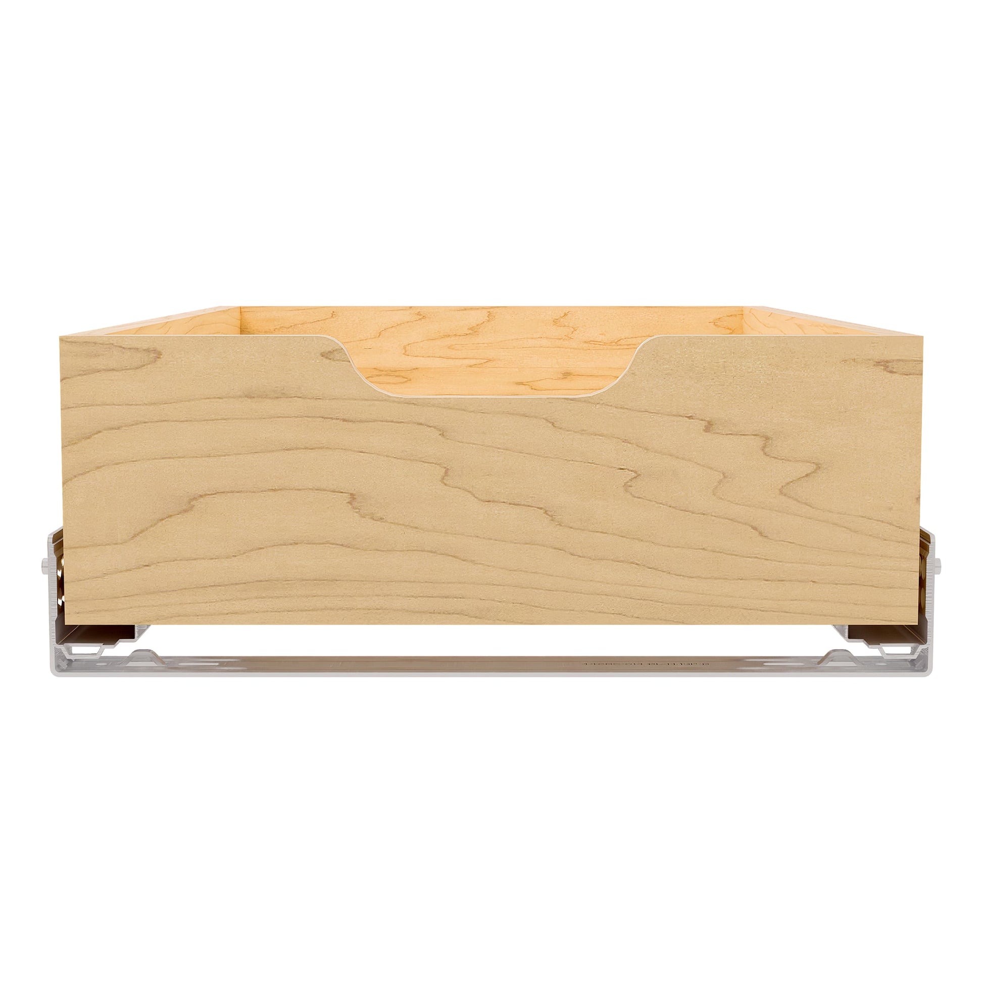This wooden Pullout drawer is installed at the base of your kitchen cabinet, boasting 75 lb. rated, 7/8 extension smooth slides. The slides are also soft-closing, retracting the shelf gently with just a little push. Once installed, the wooden drawer and hardware frame measures 22.2" deep, 14.71'' wide, and 5.57'' tall. This kitchen cabinet organizer is designed to fit cabinets with 14.75'' wide openings. The cabinet drawer is constructed with maple hardwood and a durable clear coat finish to protect the wood's natural look. This kitchen cabinet Pullout organizer comes with adjustable mounting hardware.