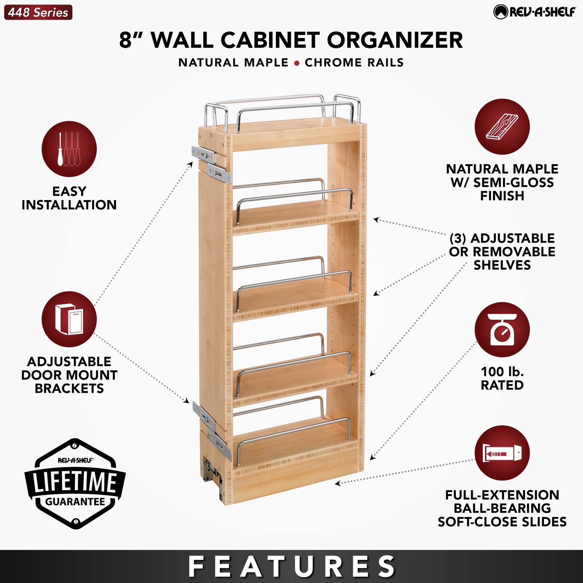 Your seasonings and canned goods will always be within reach with the Rev-A-Shelf 8'' Pullout Wood Wall Cabinet Organizer. This handy organizer features 4 levels of shelving for maximum storage space and easy access.