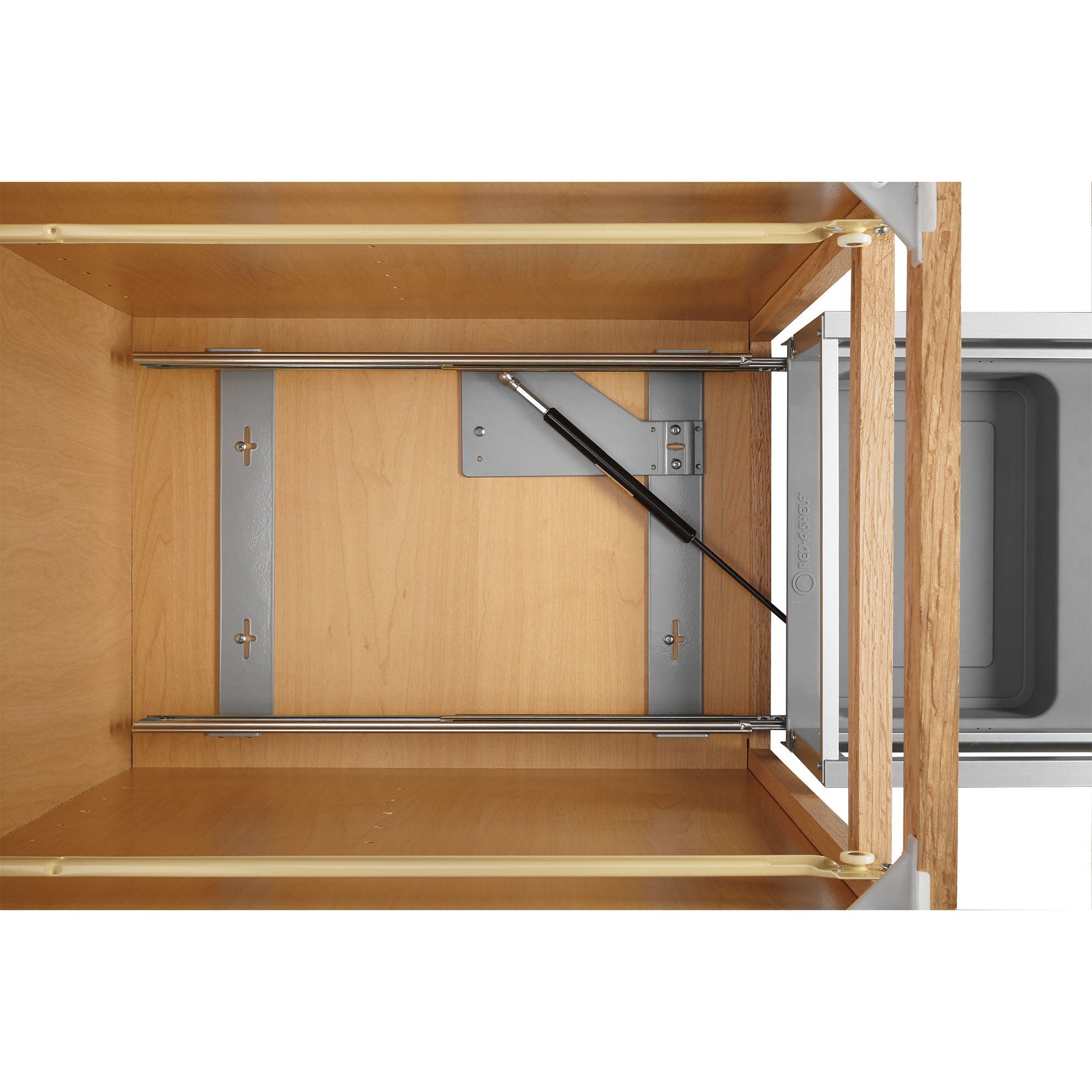Looking for a sturdy, attractive Pullout waste container that is perfect for any kitchen? Look no further than this American-made product. Discretely store your kitchen trash or recycling with this Rev-A-Shelf Pullout Cabinet Waste Container. This Pullout trash can kit includes (1) silver 35 qt. plastic waste container, brushed aluminum frame, and mounting hardware.