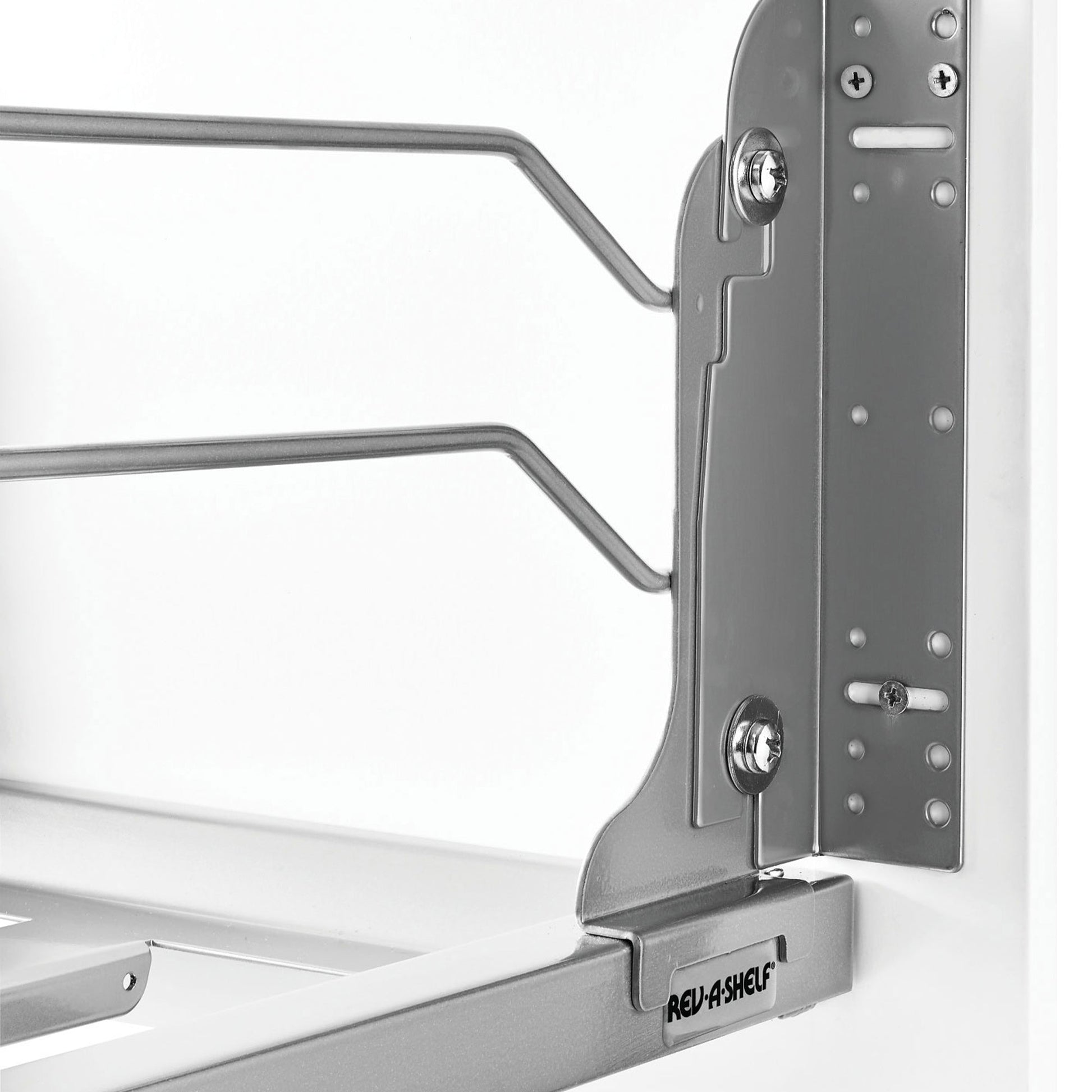 Upgrade your kitchen and get your trash off the floor and hidden in a cabinet with this Rev-A-Shelf single pullout trash container with rear storage.